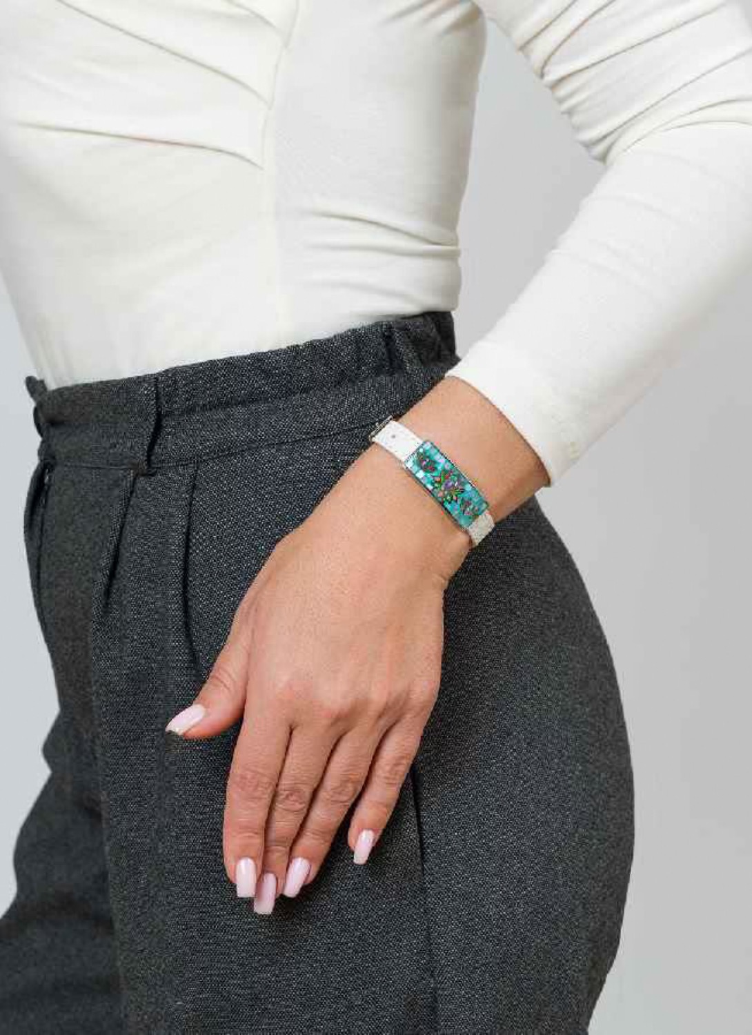 Стильный кожаный браслет с уникальным металлическим декором — идеальный аксессуар для тех, кто ценит современный дизайн и элегантность. Металлическая вставка украшена красочным абстрактным рисунком, в котором преобладают оттенки зеленого и бирюзового. Геометрический узор на металлической вставке придаёт изделию изысканный, модный акцент. Ремешок изготовлен из кожи белого цвета, придающей изделию богатый и роскошный вид. Браслет идеально подойдёт как для повседневного использования, так и для особых случаев. Он легко сочетается с разными стилями одежды — от делового до кэжуал, делая образ завершённым и стильным. Прочный замок гарантирует надёжную фиксацию и комфорт в носке.