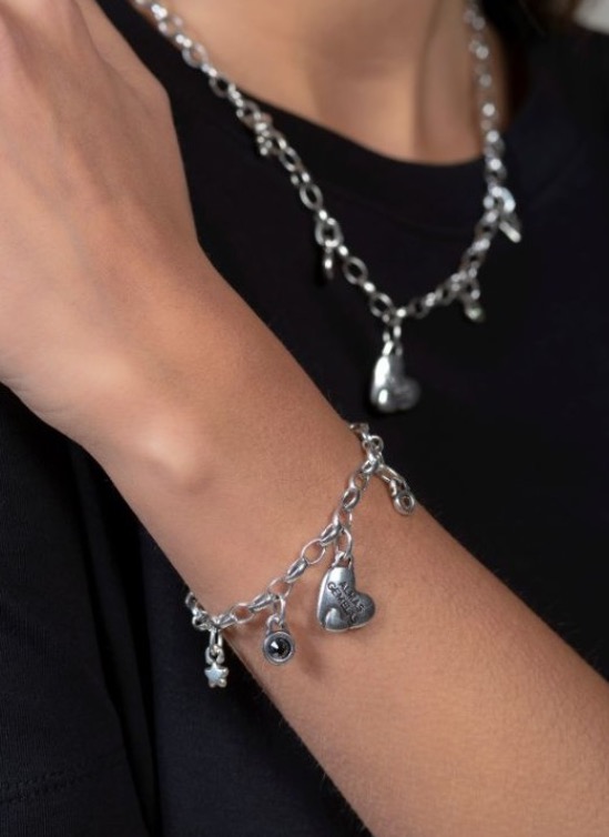 Браслет ALMAS GEMELAS создан с вниманием к символике и комфорту. Цепочка с звеньями обеспечивает прочность и гибкость, а центральный подвес в форме сердца с двуязычной надписью подчеркивает концепцию глубокой связи. Некоторые элементы украшены кристаллами, добавляющими изделию блеска и индивидуальности.
