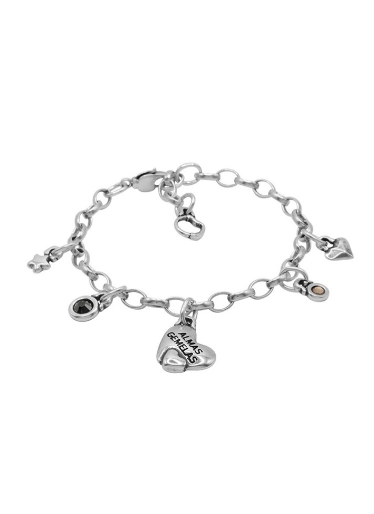 Особенность модели: Название "ALMAS GEMELAS" (духовные пары) отражает основную идею этого браслета. Центральный подвес с надписью символизирует неразрывную связь между близкими людьми. Цепочка с звеньями и дополнительные элементы с кристаллами создают гармоничный акцент на запястье. Длина до 20 см с регулируемым карабином делает браслет универсальным для любого запястья.