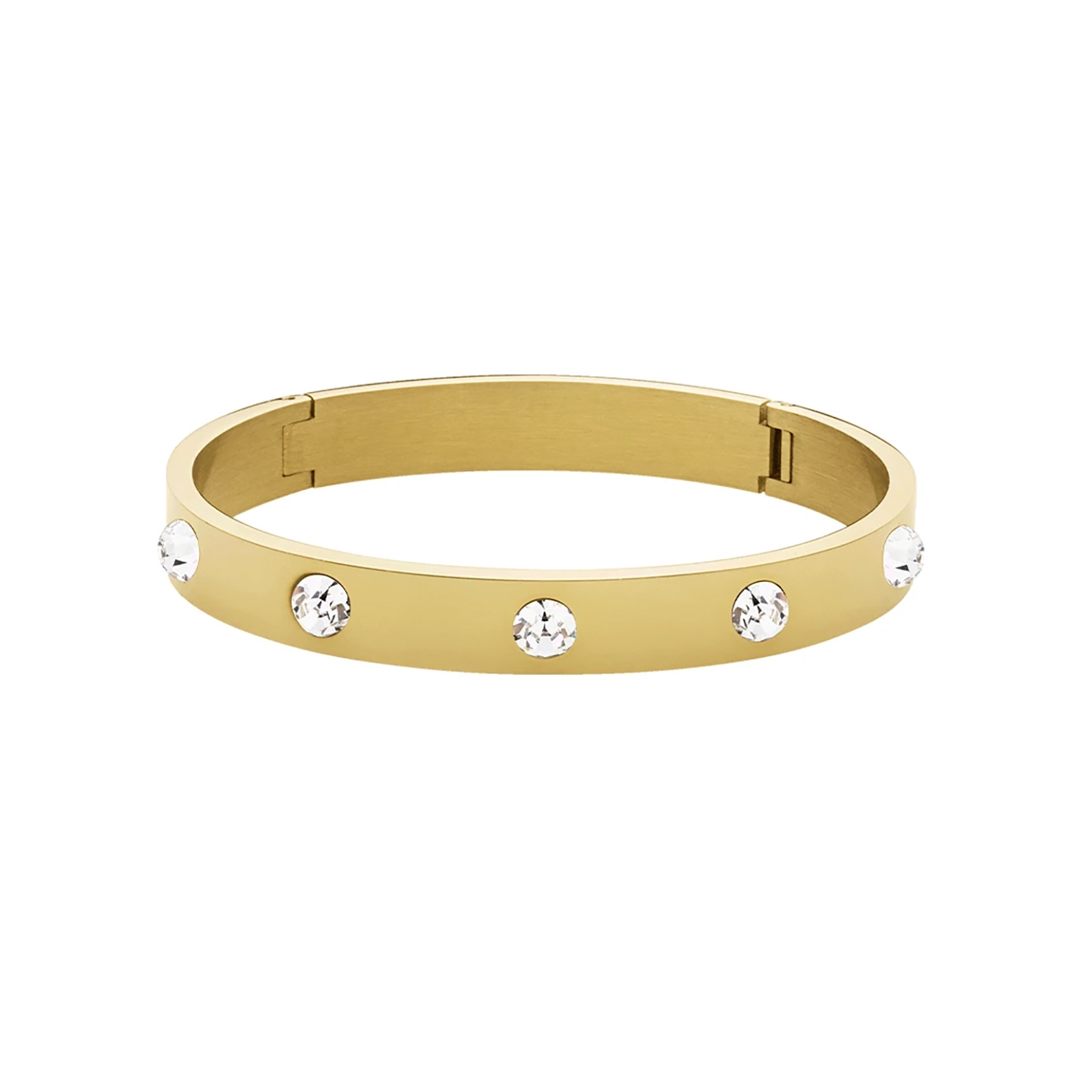 BELLA — это современный и очень элегантный браслет из нержавеющей стали, украшенный по кругу десятью сверкающими кристаллами. Носите его отдельно или в сочетании с другими браслетами из коллекции Dyrberg Kern. Этот стильный браслет открывается сзади простым щелчком. Здесь он представлен в классическом золотом цвете с белыми кристаллами. Не содержит никеля, гипоаллергенный. Датский дизайн.