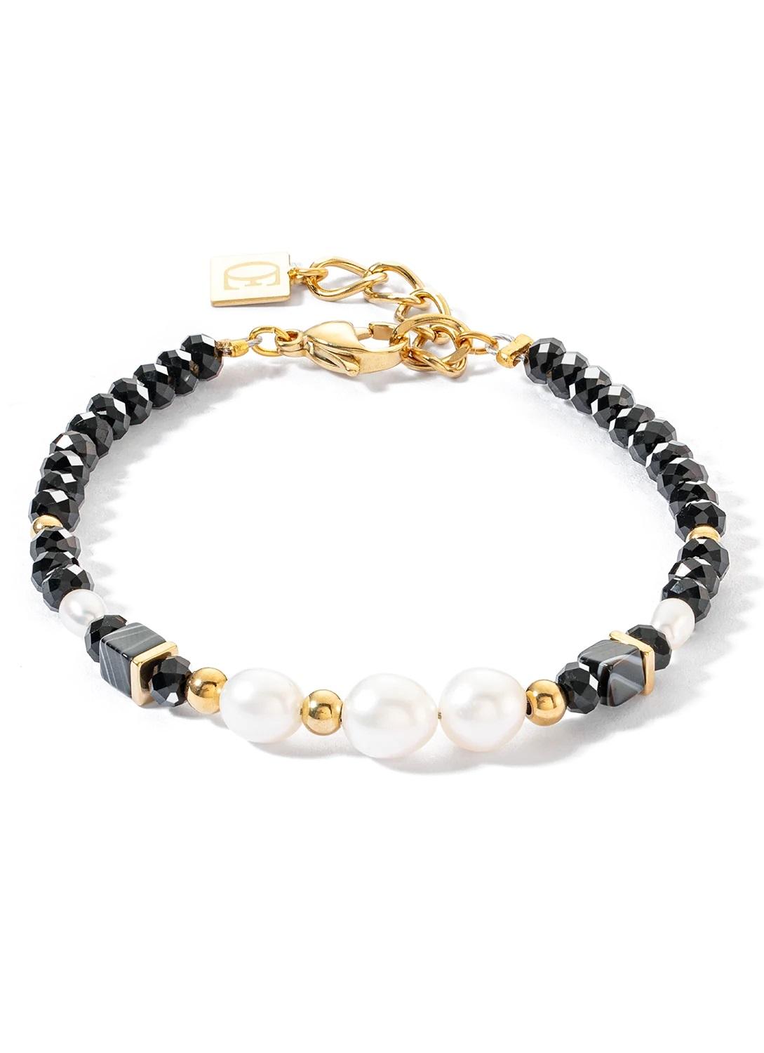Браслет из коллекции Pearls & onyx gold. Размер регулируется от 18 см до 21 см. Вставка: Пресноводный жемчуг, оникс, ювелирное стекло. Артикул 1132/30-1314