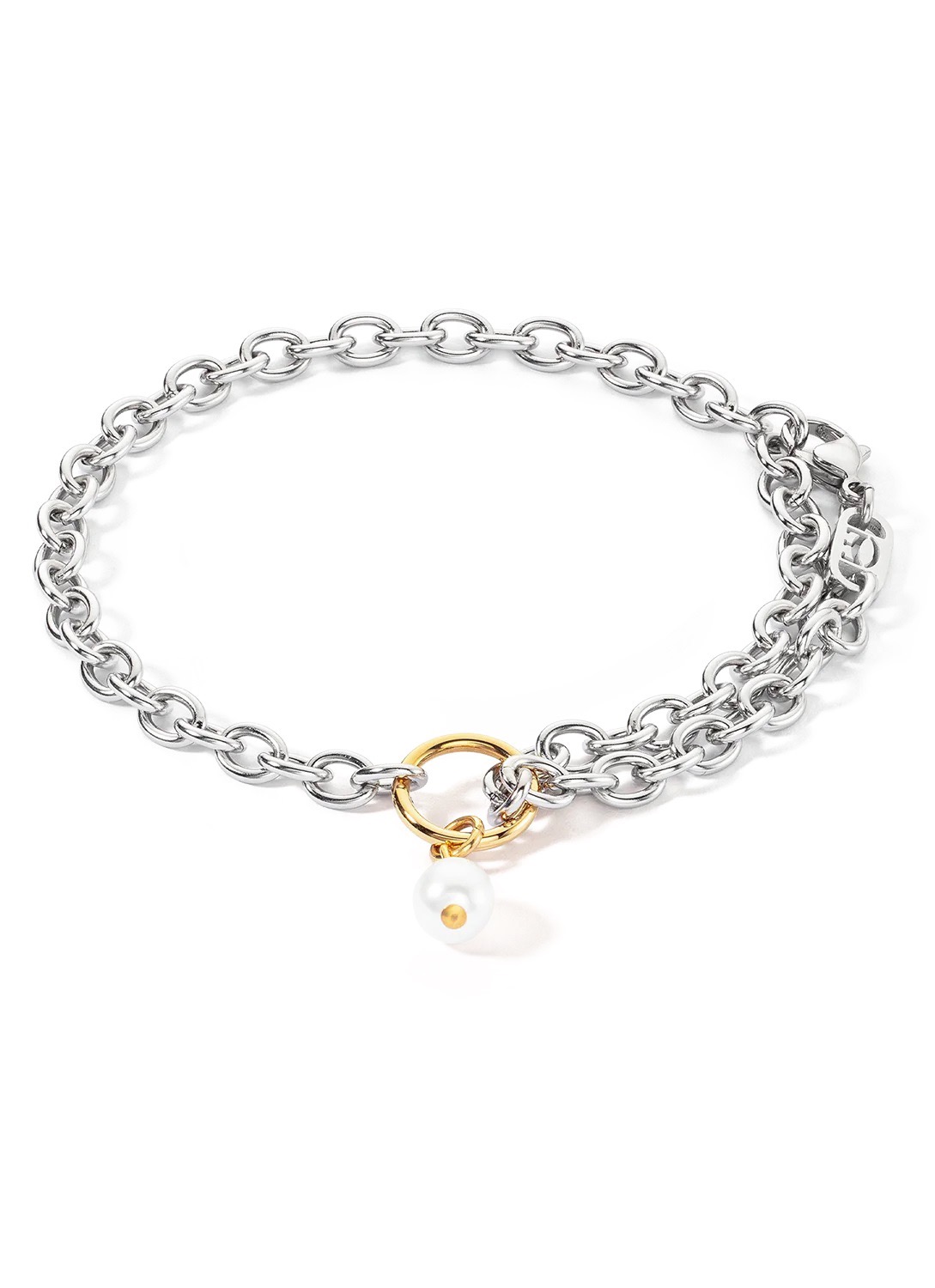 Пресноводный жемчуг придаёт браслету мягкость и глубину, а контрастное сочетание позолоченного декоративного кольца и стальной цепи подчёркивает графичность стиля Art Deco. Нержавеющая сталь обеспечивает долговечность и гипоаллергенность.