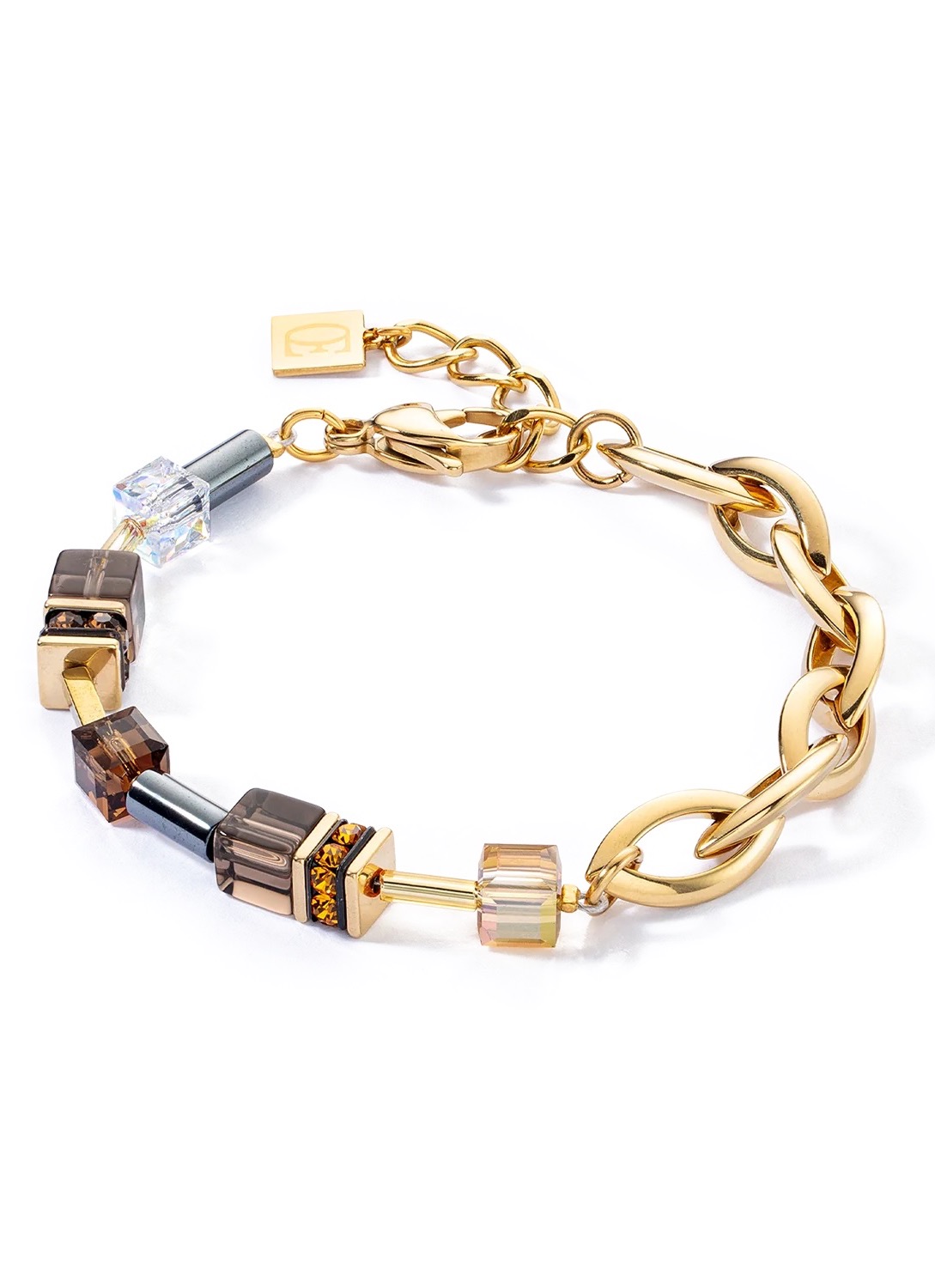Браслет из коллекции GeoCUBE Chunky Chain gold-brown. Размер регулируемый от 18 см до 21 см. Вставка: Гематит, дымчатый кварц, кристаллы Swarovski. Артикул 4524/30-1116
