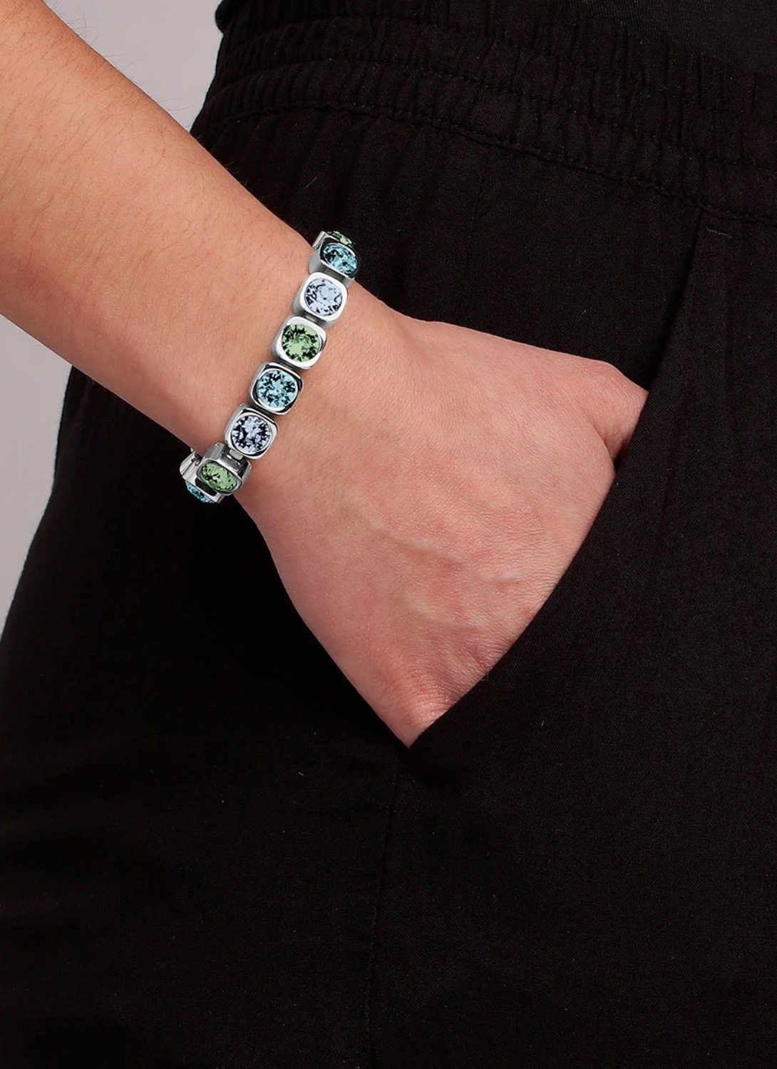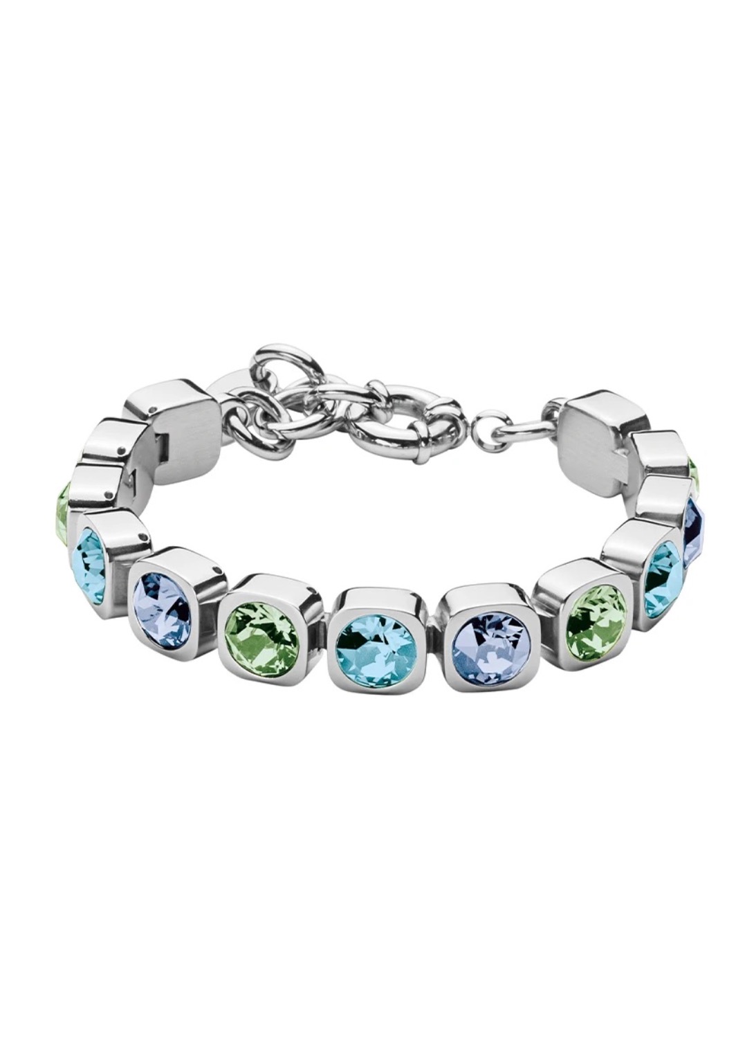 Браслет CONIAN (арт. 361035) от датского бренда Dyrberg Kern - это свежая интерпретация культового теннисного браслета, представленная в осенней коллекции 2025 года. Изготовлен из прочной нержавеющей стали с зеркально-полированным серебристым покрытием, он инкрустирован фасетированными кристаллами Swarovski в нежной пастельной палитре: голубой, зелёный и белый. При движении кристаллы переливаются, как капли росы на утренних листьях - свежие, лёгкие и завораживающие.