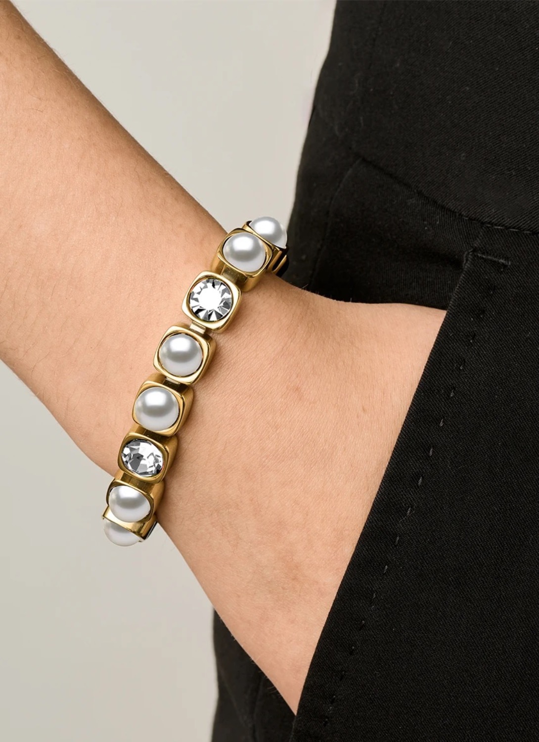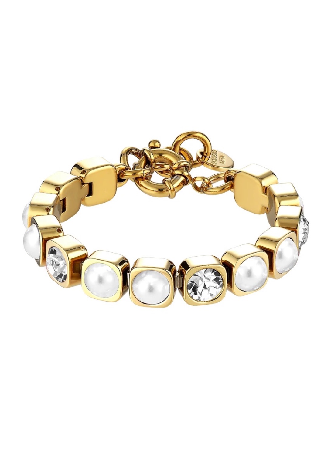 Браслет CONIAN (арт. 450157) от датского бренда Dyrberg Kern - гармоничный союз силы и нежности. Изготовлен из прочной нержавеющей стали с зеркально-полированным золотистым покрытием, он инкрустирован чередующимися элементами: матовыми белыми жемчужинами с перламутровым сиянием и прозрачными фасетированными кристаллами Swarovski. При движении они переливаются, как капли росы под утренним солнцем - свежие, романтичные и завораживающие.
