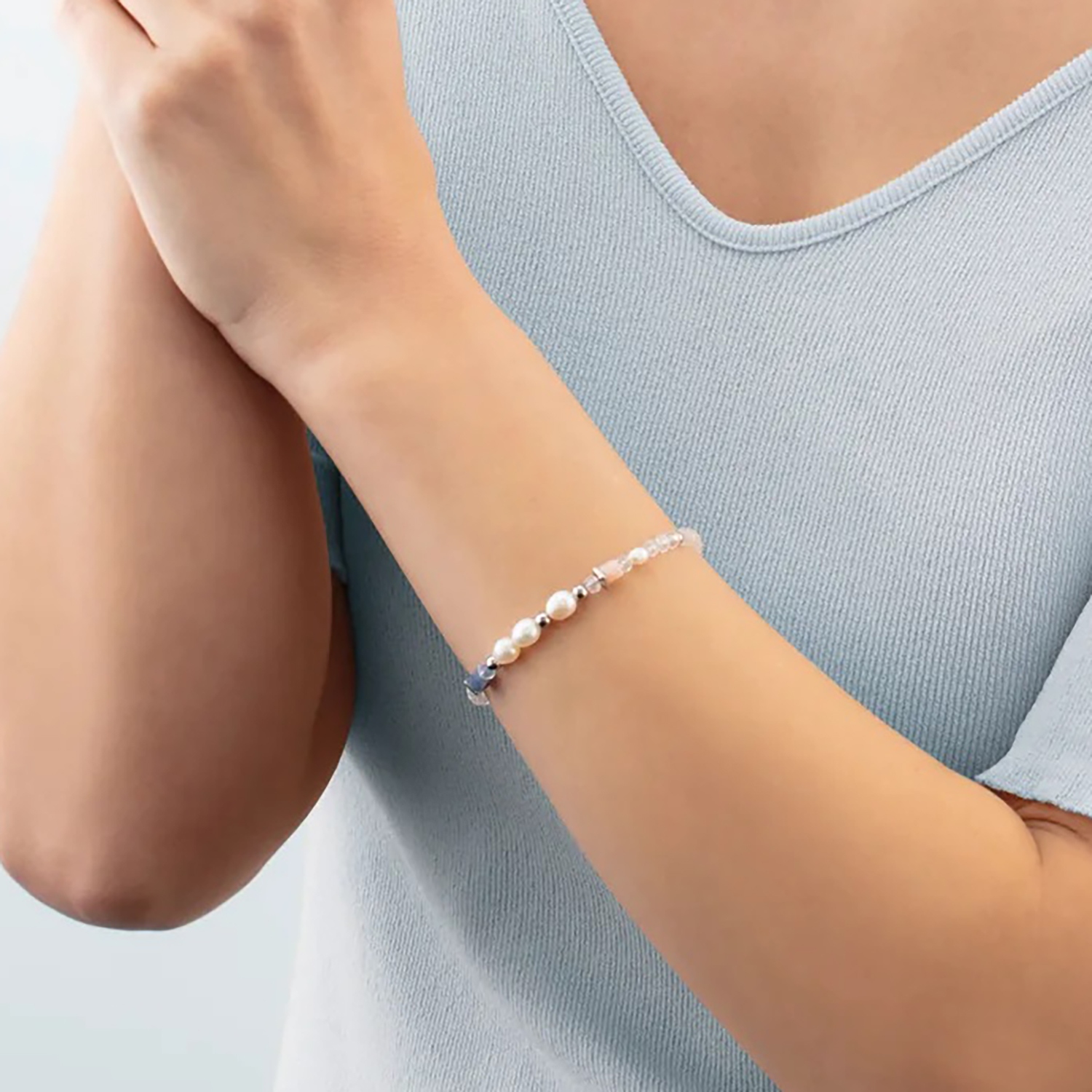 Браслет Cosmic Pearls Soft Silver от бренда Coeur de Lion (арт. 1135/30-1522) сочетает пресноводный жемчуг, натуральные камни и нержавеющую сталь серебристого цвета. Центральный элемент украшения — жемчужины, обрамленные халцедоном, амазонитом, голубым и розовым авантюрином.