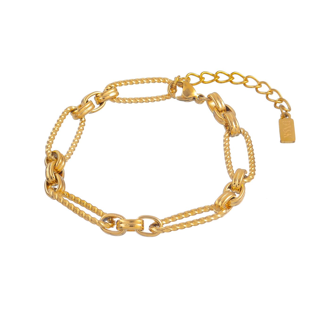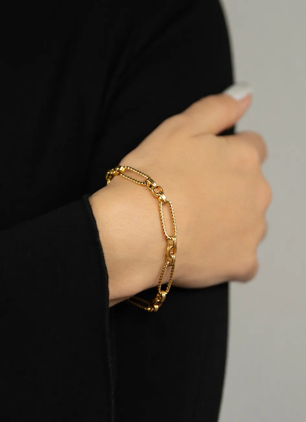Особое внимание заслуживают кручёные овальные звенья, придающие браслету утонченную динамику и модную фактуру. Универсальная длина обеспечивает комфортную посадку на запястье, а надежный замок-карабин позволяет легко надевать и снимать изделие.