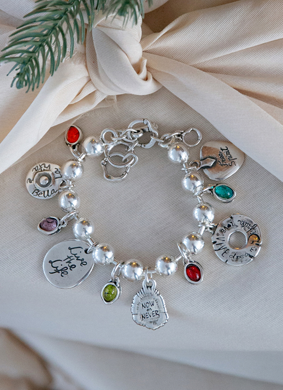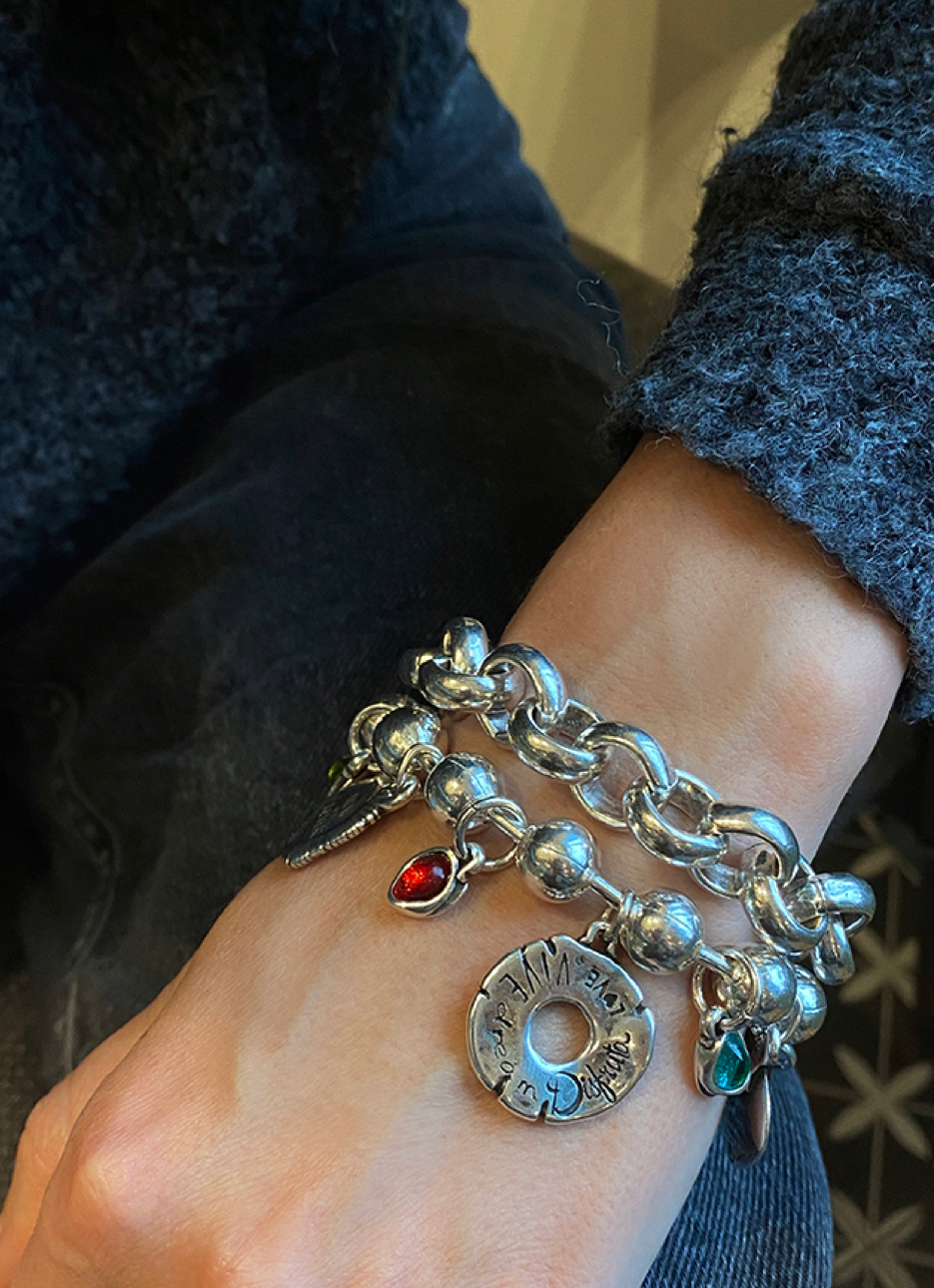 Браслет Ciclon выполнен в виде цепочки с разноцветными подвесками и медальонами с позитивными пожеланиями. Т-образный замок. Длина регулируемая 17-20 см.