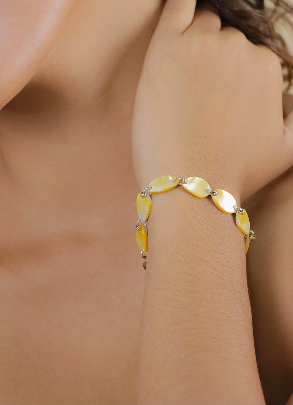 Браслет выполнен из дерева роблес и натурального перламутра .