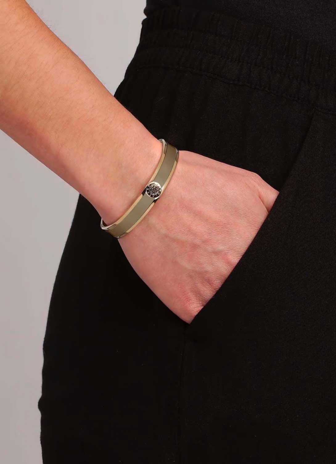 Стильное изделие из классической коллекции Dyrberg/Kern, браслет PENNIKA с ручной росписью эмалью в самых красивых оттенках сезона, - женственный, модный и роскошный. Браслет выполнен из нержавеющей стали с удобной и надежной застёжкой-петлей и украшен монограммой DYRBERG/KERN. Здесь он представлен в полированном золотом цвете и золотисто-дымчатой эмали. Датский дизайн.