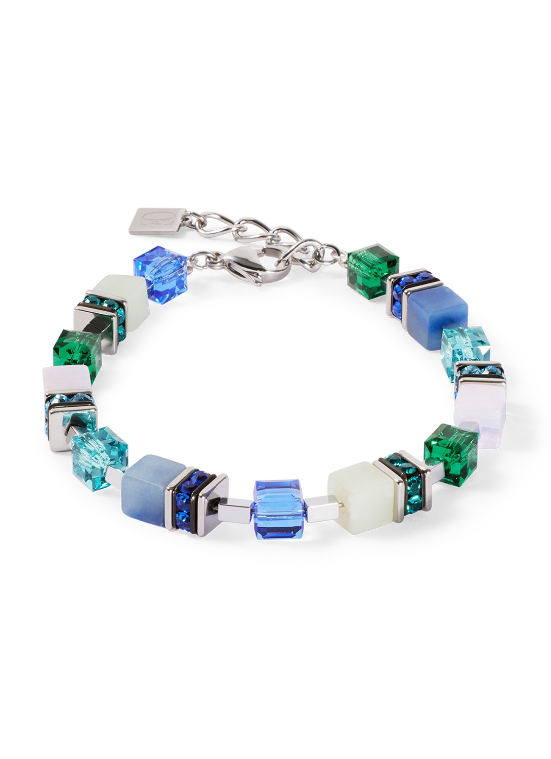 Как тихий шум океана — браслет GeoCUBE® Precious Statement в серебристо-голубом цвете сочетает в себе прохладные голубые тона, блестящие кристаллы Swarovski® и драгоценные камни в форме кубиков, создавая гармоничный современный образ. Серебристые детали придают свежий, элегантный вид — идеально на каждый день или для особых случаев.