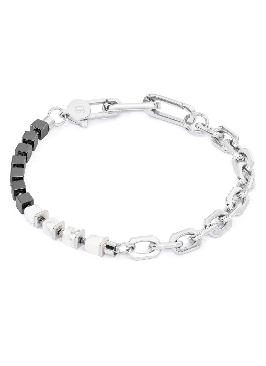 В этом современном асимметричном дизайне культовые GeoCUBES® из белого галита и мерцающего тёмным цветом гематита сочетаются с эффектными звеньями из нержавеющей стали. Отдельные звенья из нержавеющей стали в застёжке можно снять, что позволяет регулировать длину от 19 до 22 см для любого запястья.
