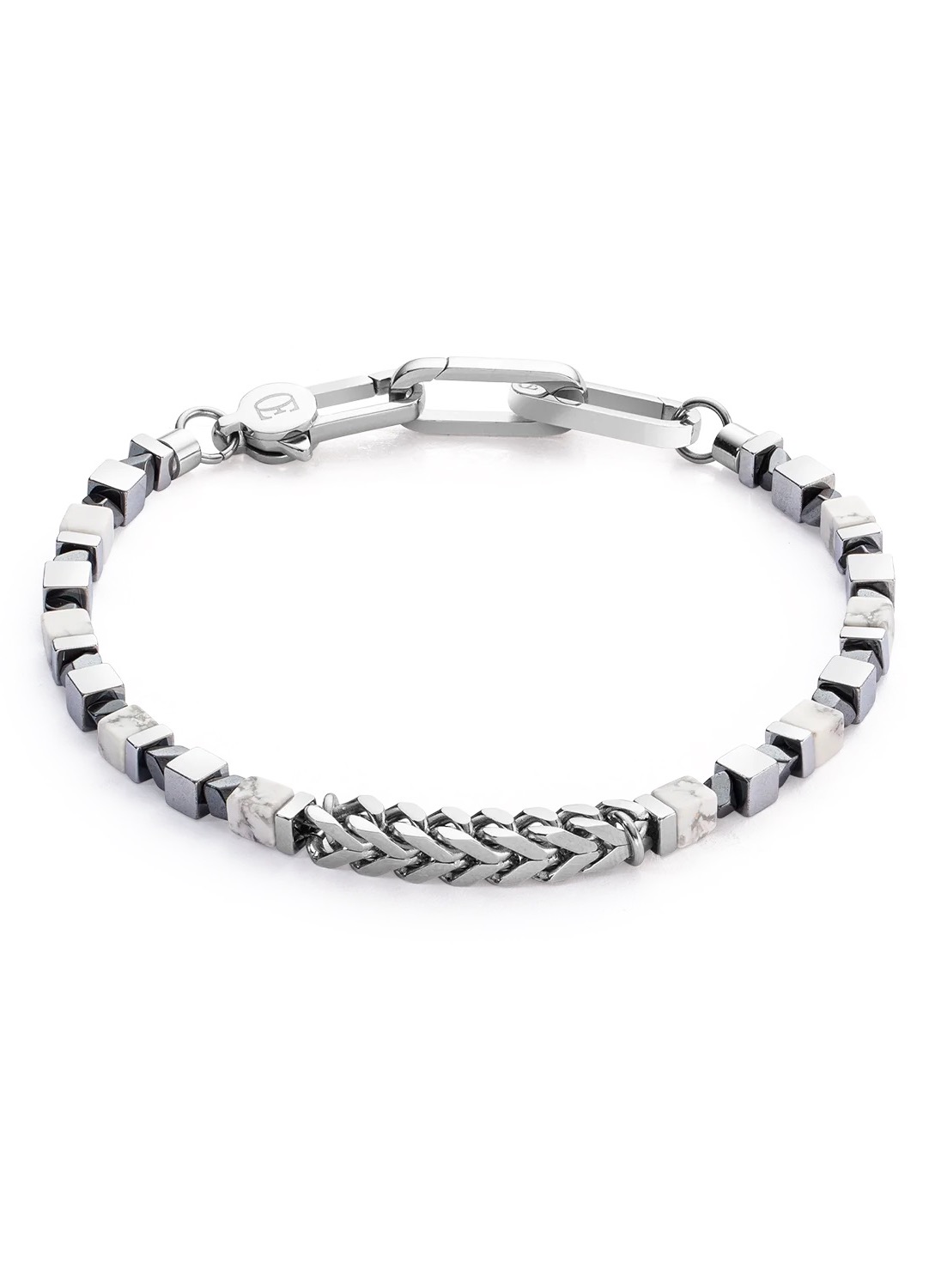 Браслет Precious Cubes & Chain белого и серебряного цветов - шедевр минималистского дизайна. Гладкие кубики говлита и мерцающий гематит с отделкой из оксида титана подчеркивают изысканность плетеной цепочки из нержавеющей стали. Это изделие является воплощением сдержанной элегантности и идеально подходит для мужчины, который ценит в жизни все самое прекрасное. Размер регулируется от 19,5 до 21,5 см