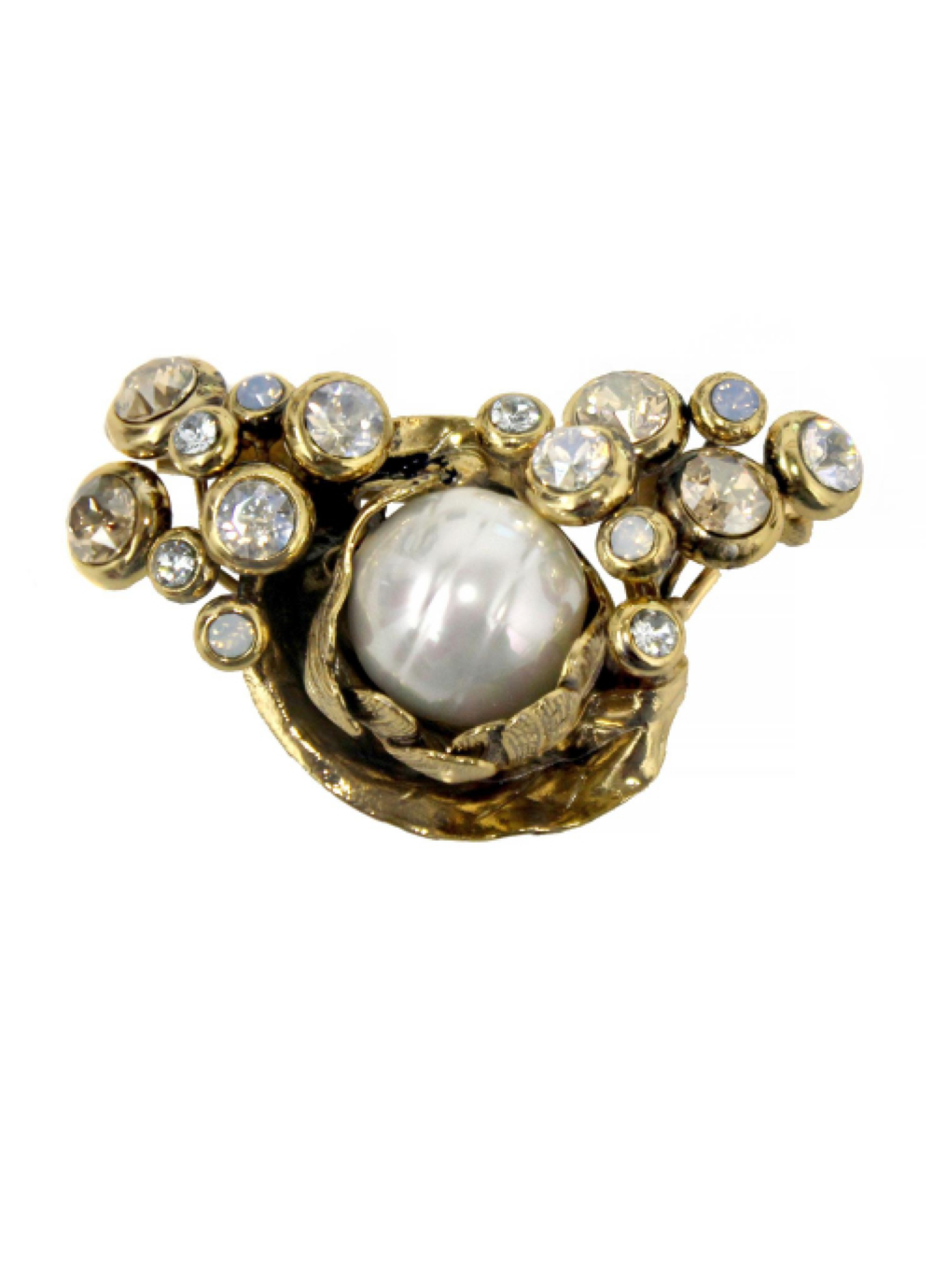 Брошь Claudio Canzian в виде большо кристалла с обрамлением цветами. Артикул: CC00211158. Размер кулона около 5 см на 6 см. Изготовлено из латуни в гальваническом покрытии из золота. Вставки: чешское стекло.