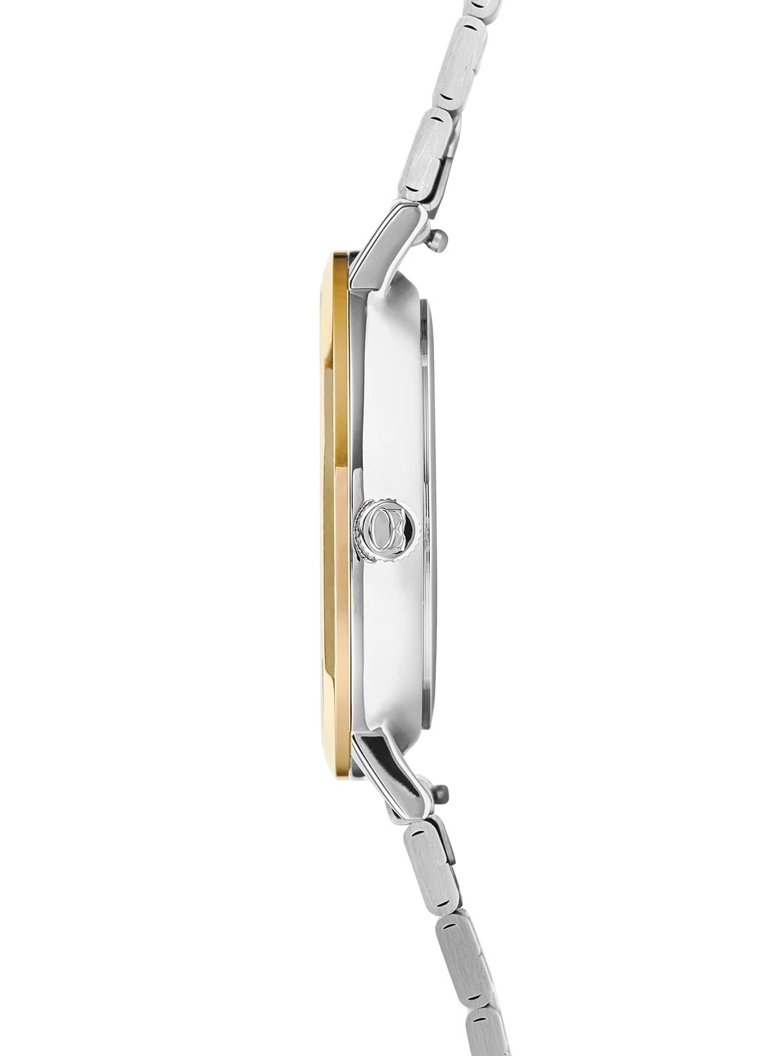 Корпус из полированной нержавеющей стали. Безель теплого золотистого цвета. Браслет часов изготовлен из матированных звеньев. Циферблат мягкого белого цвета с тонкими индексами в серебряных, золотых и антрацитовых оттенках. Такой биколорный дизайн делает часы универсальным украшением, легко сочетающимся как с золотыми, так и с серебряными аксессуарами.