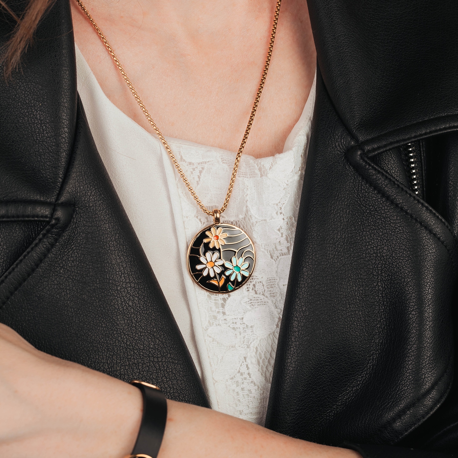 Очаровательное колье от бренда Fiore Luna предлагает новое прочтение стиля ар-деко. Это эффектное украшение, выполненное из высококачественного бижутерного сплава, идеально сочетает в себе стиль и долговечность, делая его незаменимым аксессуаром для любой модницы. Ожерелье на цепочке венецианского плетения гармонично дополнит любой образ и, несомненно, привлечет всеобщее внимание благодаря круглому кулону с цветочным узором, декорированному цветной эмалью. Такое украшение станет прекрасным акцентом в любой обстановке, добавляя вашему стилю нотки элегантности и утонченности.
