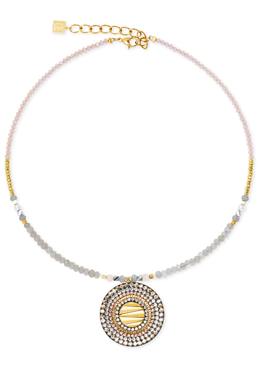 Колье Amulet Modern Future от бренда Coeur de Lion (арт. 2036/10-1016) сочетает природные материалы и современный дизайн. Центральный элемент — амулет диаметром 3,5 см, выполненный из агата, Crystal Pearl, кристаллов Swarovski и нержавеющей стали с золотым покрытием.