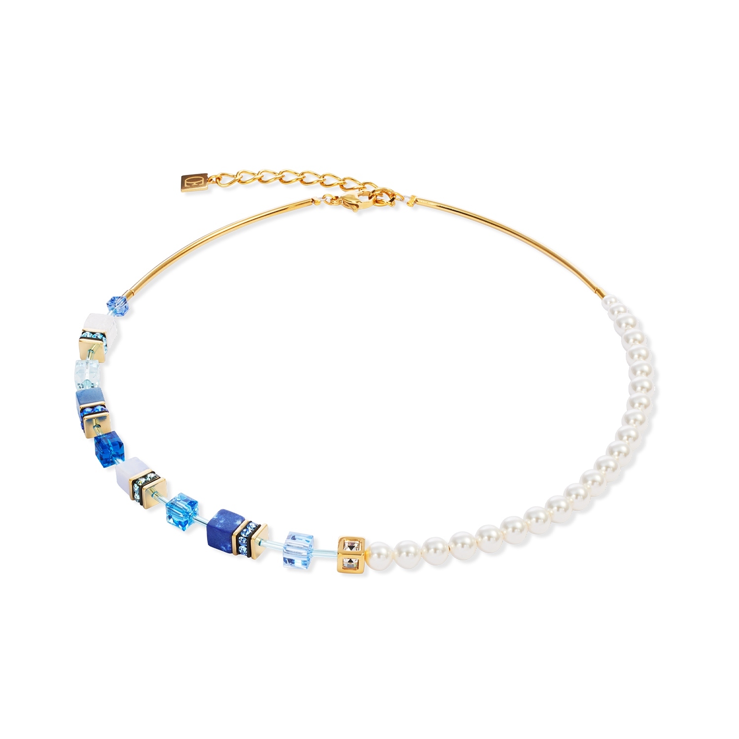 Глубокие синие тона, драгоценные материалы, неподвластная времени элегантность — ожерелье GeoCUBE® Precious Fusion Pearls в синем цвете сочетает в себе высококачественные драгоценные камни, такие как лазурит, халцедон и голубой авантюрин, с мерцающими хрустальными жемчужинами Swarovski®. Ограненные камни создают мягкое свечение, а нержавеющая сталь золотого цвета придает дизайну теплый, роскошный вид. Современная классика для стильных образов.