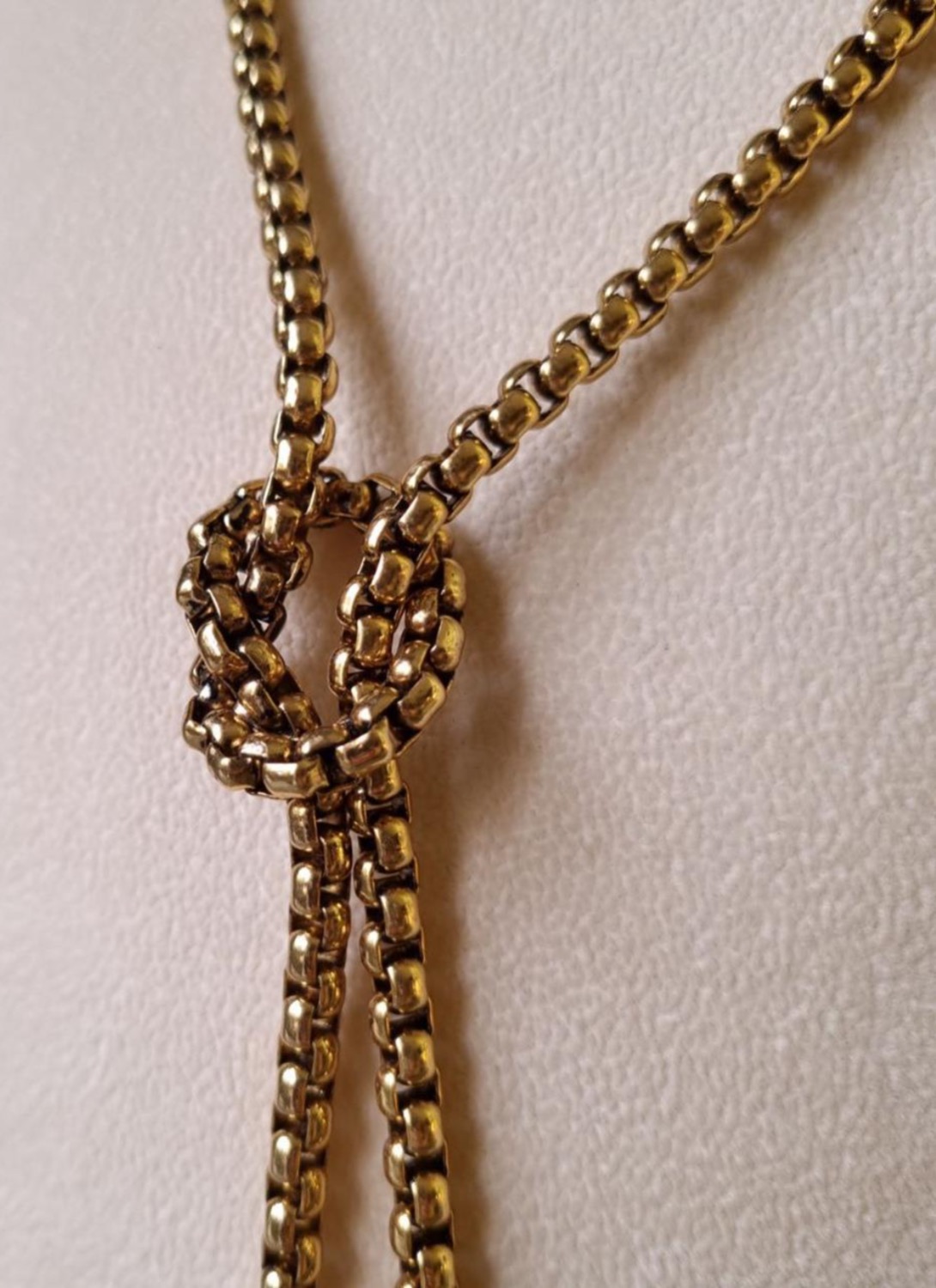 Особенность модели: Колье выполнено из гипоаллергенного латунного сплава с гальваническим золотым покрытием, обеспечивающим долговечный блеск и устойчивость к царапинам. Узел расположен в центре композиции и служит не только декоративным, но и смысловым акцентом. Длина колье 87 см. Вес всего 48 граммов, что обеспечивает комфорт даже при многочасовом ношении.