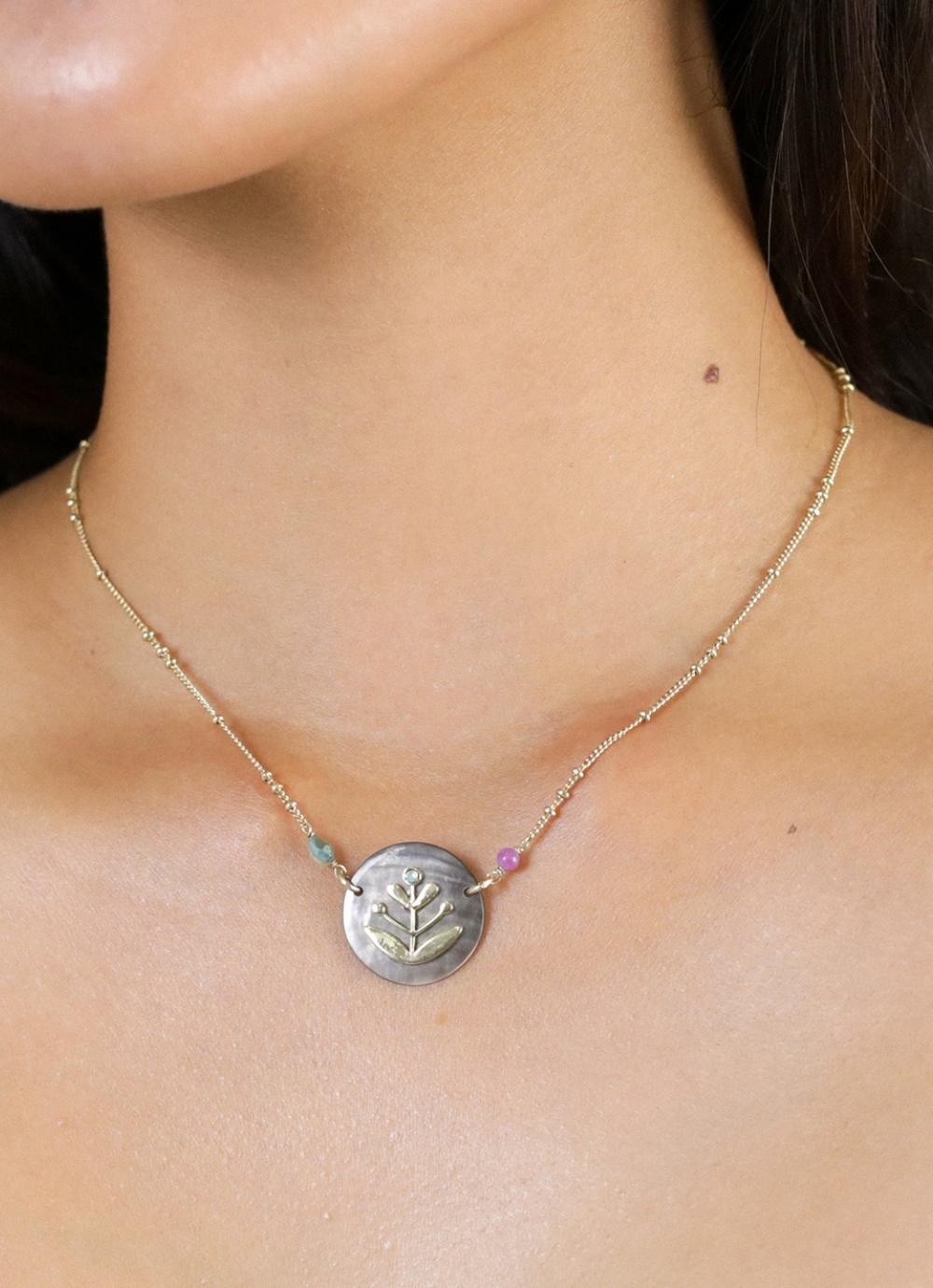Одним из главных акцентов этого колье являются вставки из перламутра, кристалла Swarovski, стеклянной бусины и арагонита.