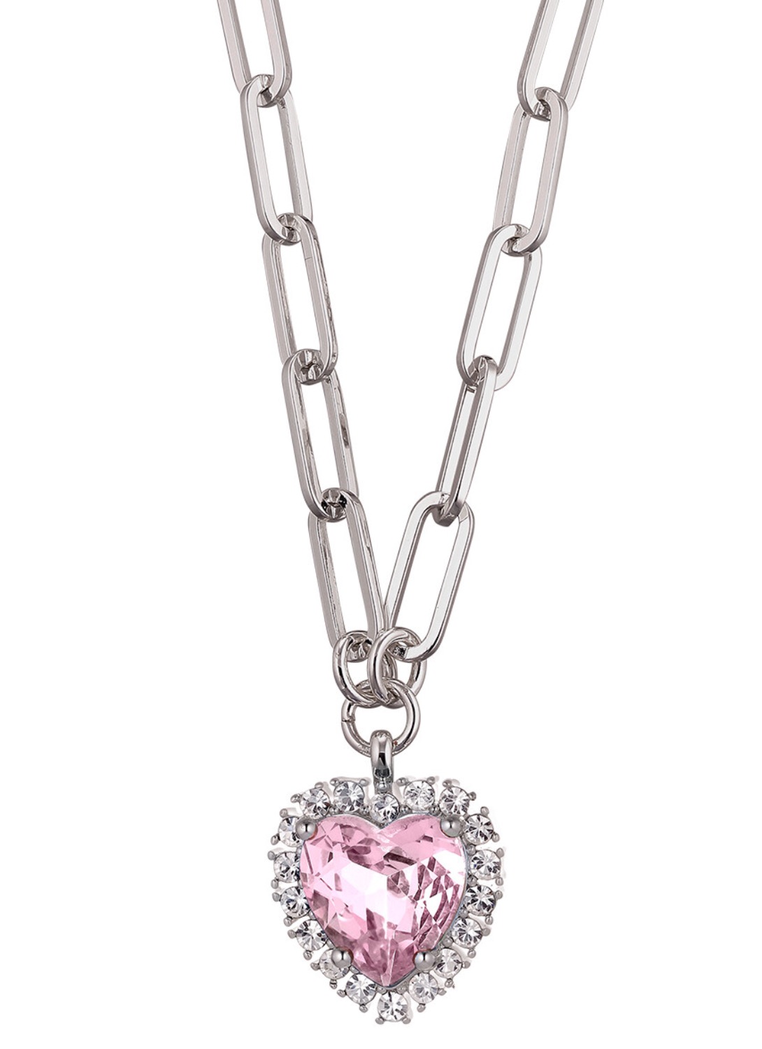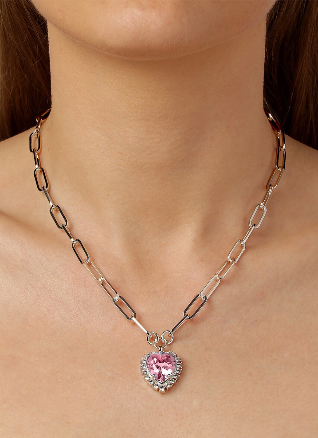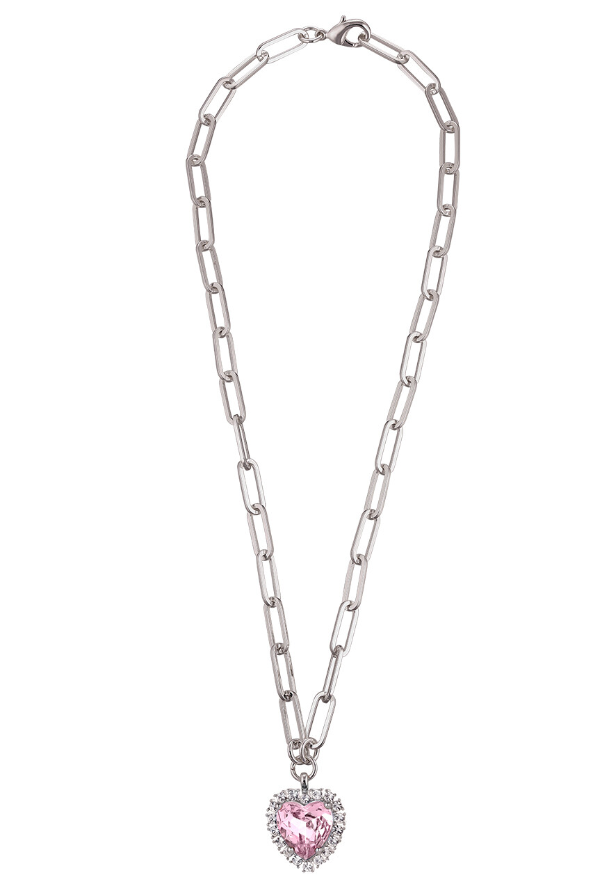 SIMONA — это современная романтическая массивная цепочка на шею, изготовленная из тяжёлых золотистых звеньев. Кулон украшен большим сверкающим гранёным светло-зеленым кристаллом в форме сердца, обрамлённым множеством светло-розовых кристаллов поменьше. Цепочка и кулон изготовлены из латуни. Датский дизайн.
