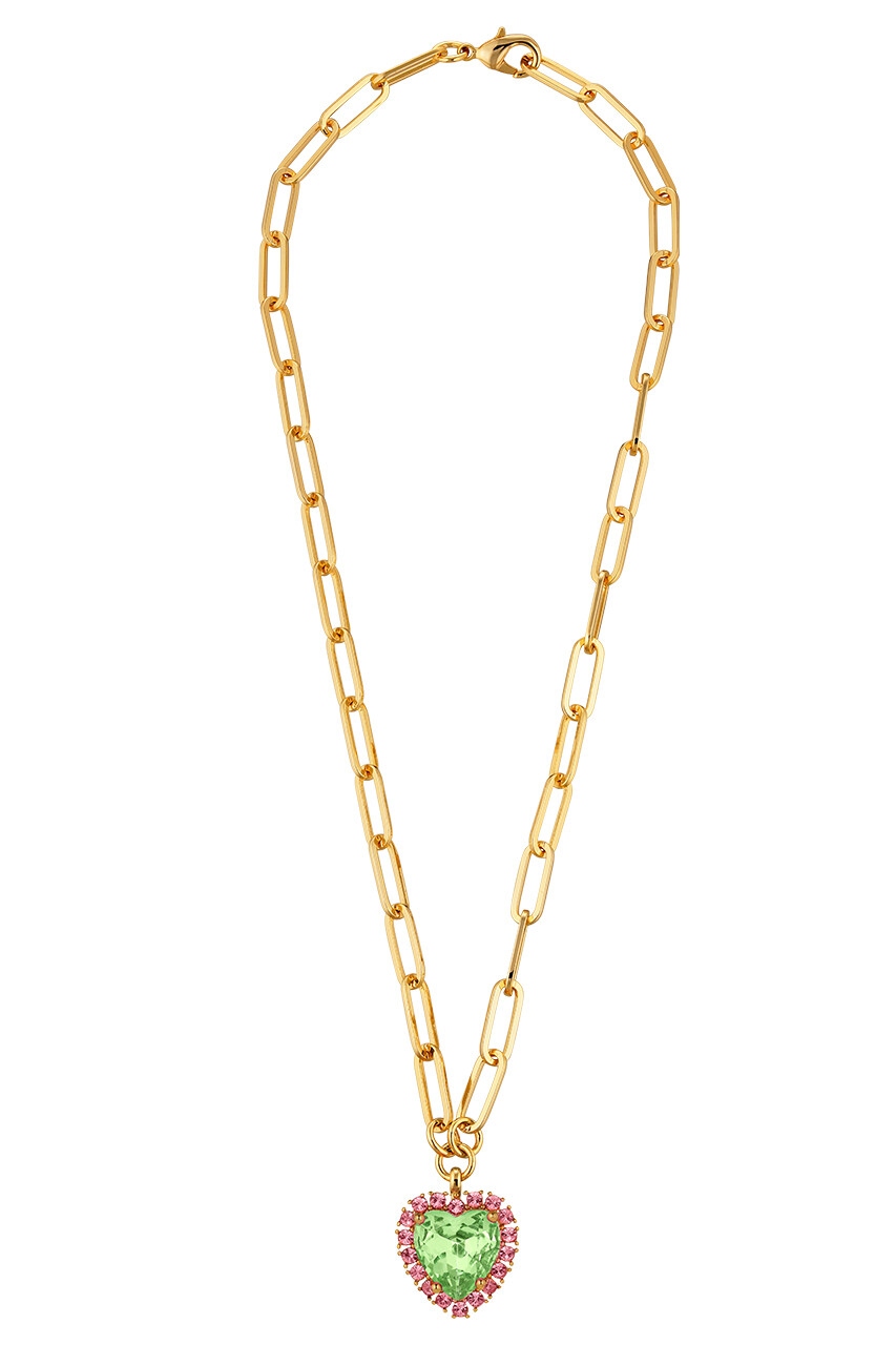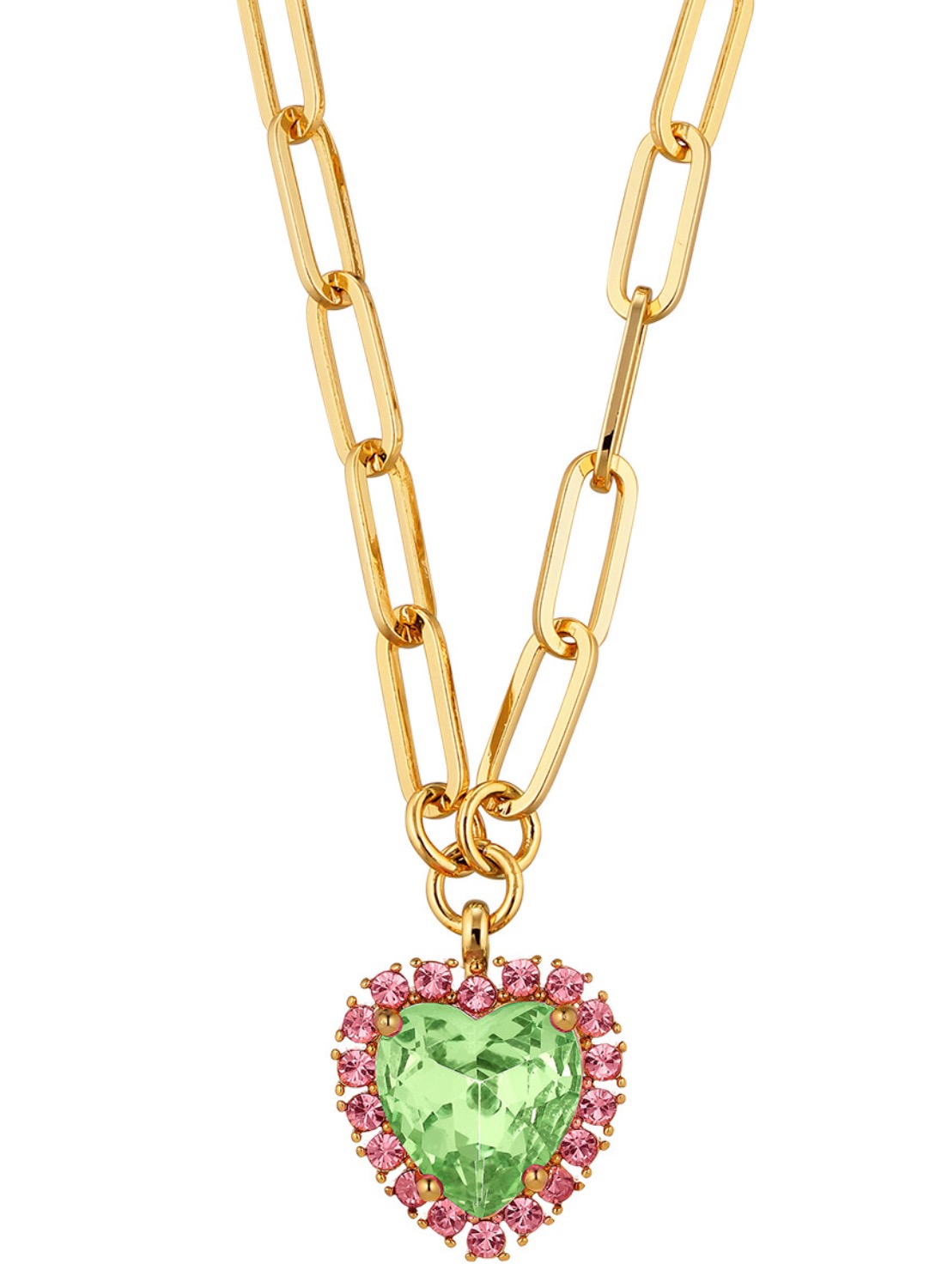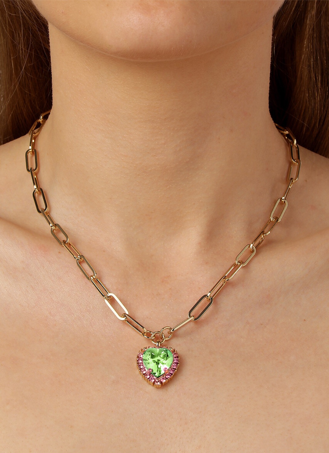 SIMONA — это современная романтическая массивная цепочка на шею, изготовленная из тяжёлых золотистых звеньев. Кулон украшен большим сверкающим гранёным светло-зеленым кристаллом в форме сердца, обрамлённым множеством светло-розовых кристаллов поменьше. Цепочка и кулон изготовлены из латуни. Датский дизайн.