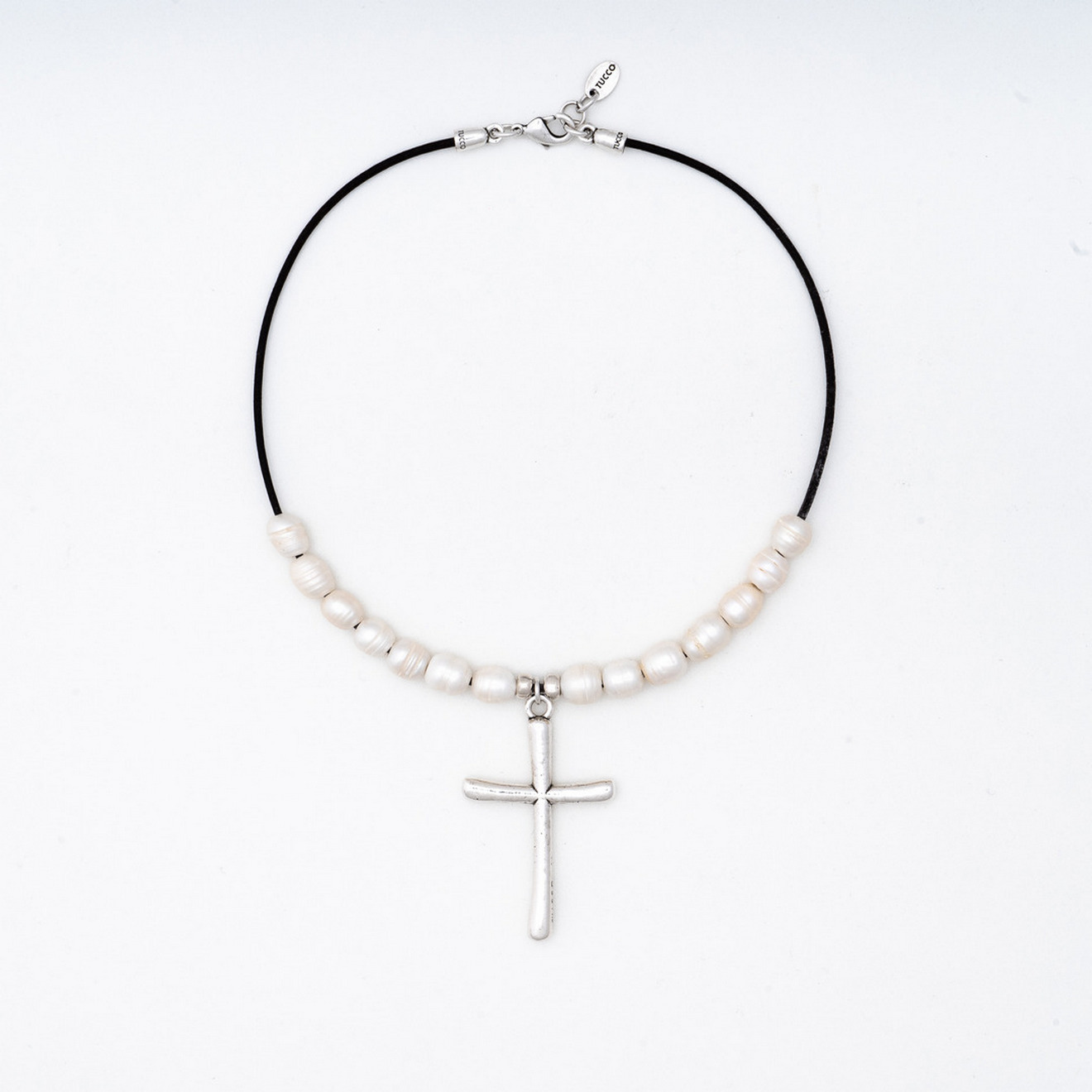 Колье выполнено из бижутерного сплава высокого качества с использованием натурального жемчуга и кожи, что придает ему эксклюзивности и оригинальности. Центральным элементом дизайна является подвеска-крест, который является не только модным акцентом, но и мощным символом для многих людей.