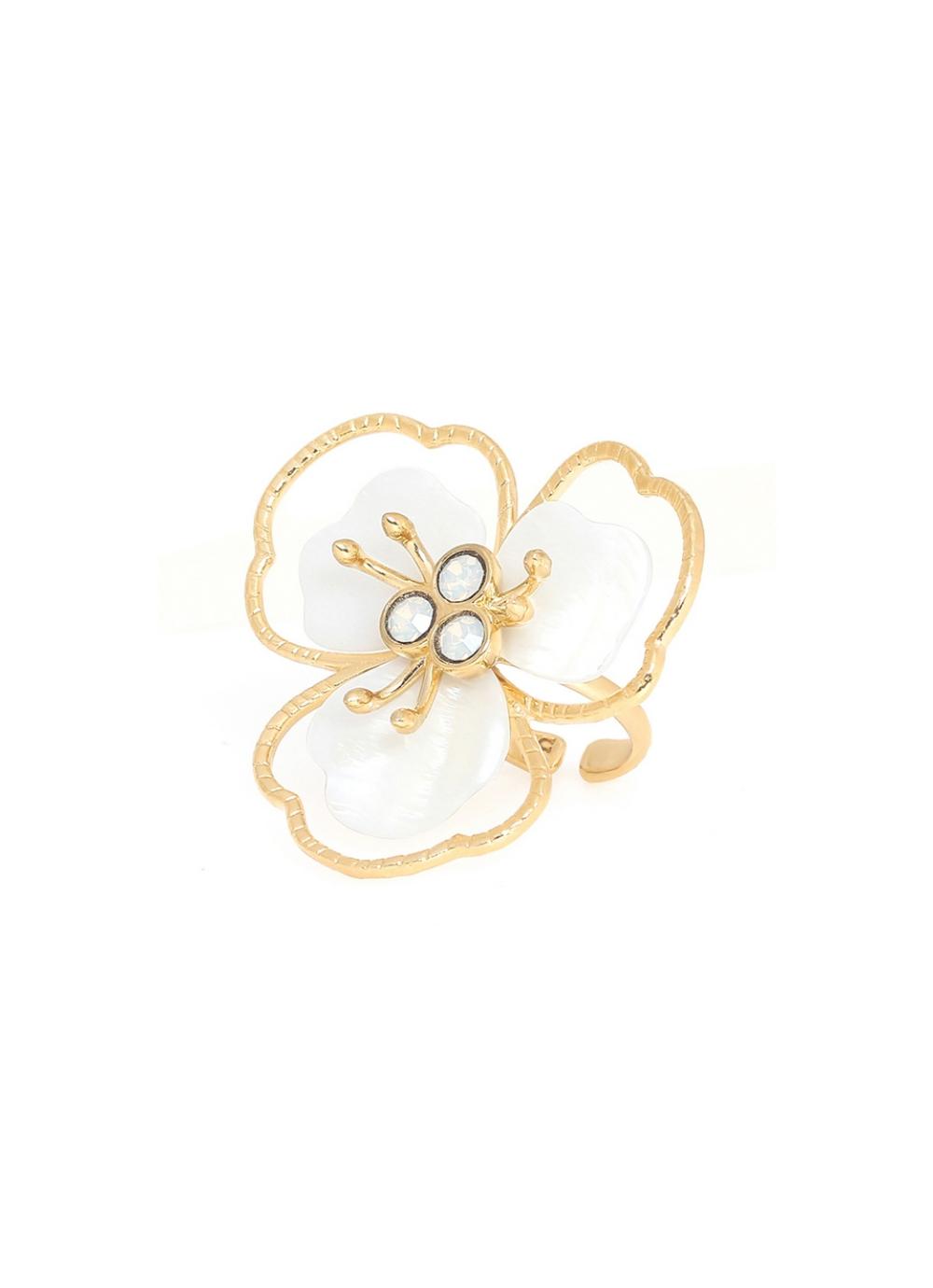 Центральным элементом кольца является натуральный перламутр, который гармонично сочетается с кристаллами Swarovski