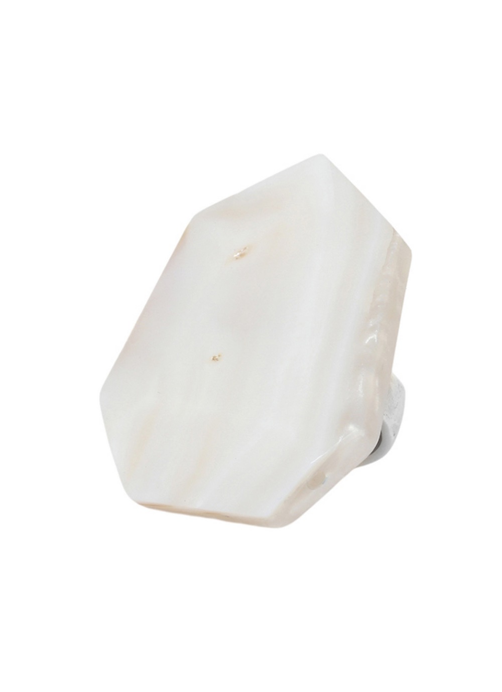 В центре композиции — натуральная вставка из перламутра, обладающая мягким жемчужным сиянием. Перламутр известен своей способностью играть светом, переливаясь нежными оттенками, что придает изделию особое очарование. Серебристый оттенок металлической основы гармонично сочетается с белоснежной вставкой, создавая современный и утончённый дизайн.