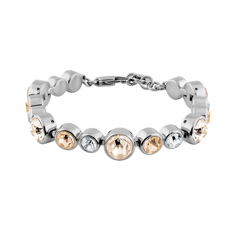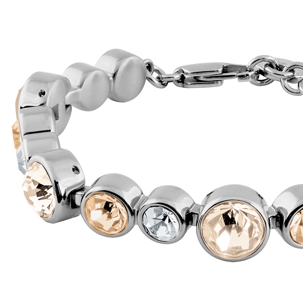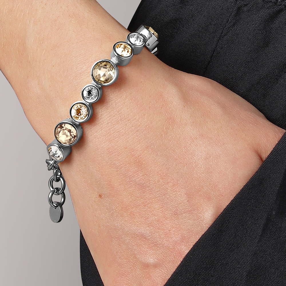 CALICE — это массивный и привлекающий внимание браслет-цепочка с рядом кристаллов разных размеров для необычного внешнего вида. Изготовлен из нержавеющей стали, покрыт и отполирован до совершенства. Здесь представлен в модном сочетании кристаллов в песочных тонах на серебристой основе. Датский дизайн, без никеля.