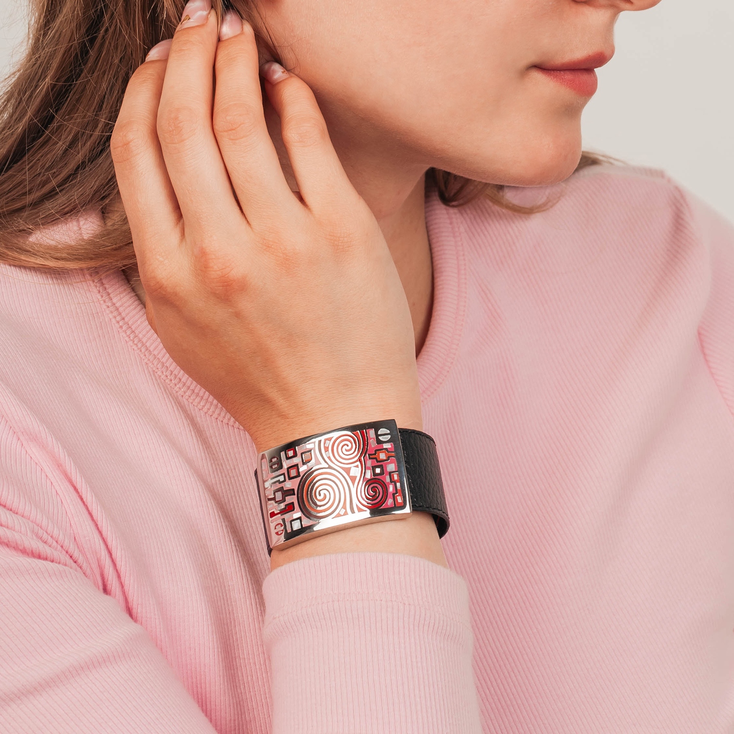 Кожаный браслет из новой коллекции Fiore Luna - это изысканный аксессуар, который идеально сочетает в себе стиль модерн и классические элементы. Изготовленный из высококачественной воловьей кожи, этот браслет не только привлекает внимание своей элегантностью, но и обеспечивает комфортное ношение благодаря приятной поверхности. Эффектная металлическая вставка, декорированная в технике холодной эмали, добавляет браслету изысканности и уникальности.