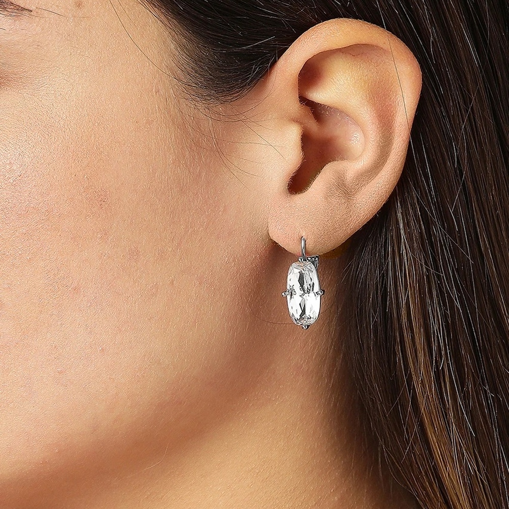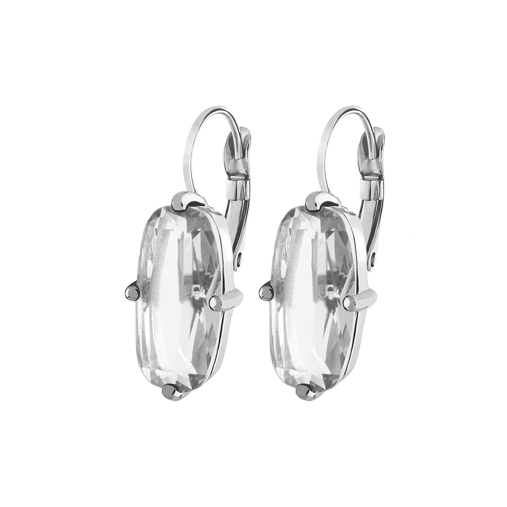BARITA — классические французские серьги-крючки с мягким прямоугольным кристаллом, закрепленным в оправе. Эти серьги можно носить как днем, так и вечером — они действительно универсальны. Здесь представлены с белыми кристаллами на серебристой основе. Датский дизайн, без никеля.