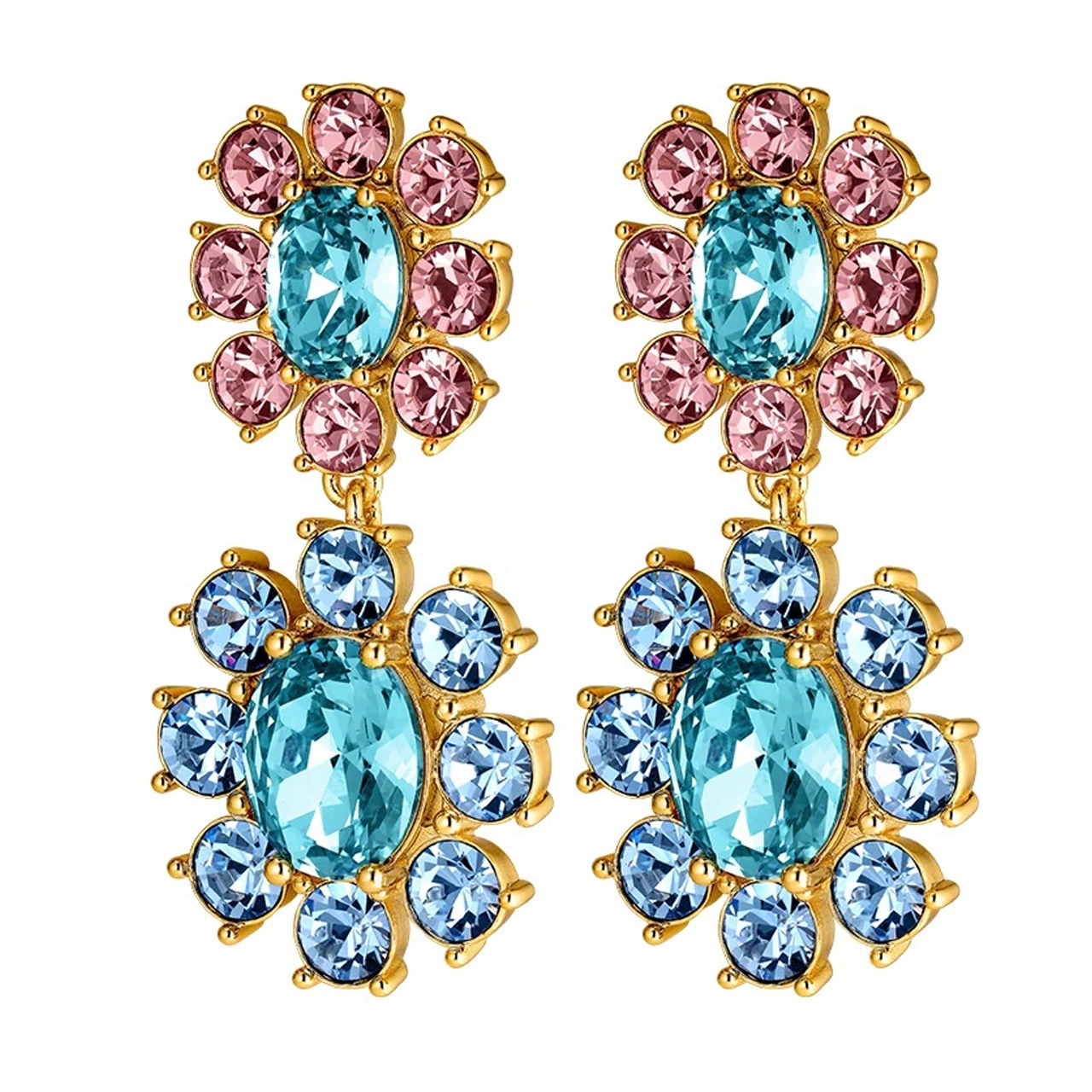 LINA - эффектные и гламурные серьги, выполненные из полированной латуни в цветочном стиле. Эта модель в стиле ретро украшена двумя крупными кристаллами, окаймленными еще более сверкающими кристаллами в соответствующей или контрастной цветовой палитре. Штифт изготовлен из хирургической стали. Здесь представлено сочетание светло-голубых,голубых и розовых кристаллов на золотой отделке. Датский дизайн ручной работы без никеля.