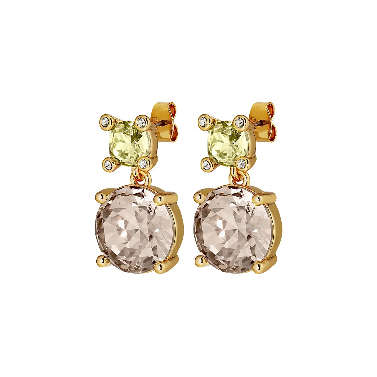 NICOLA - крупный кристалл 15 мм, расположенный под контрастным кристаллом меньшей огранки, обрамленный полированной латунью. Замок из хирургической стали, а корпус из полированной латуни. Здесь представлены в золотом тоне и золотисто-персиковом сочетании. Общая длина 28 мм. ДАТСКИЙ дизайн - без кадмия, свинца и никеля.