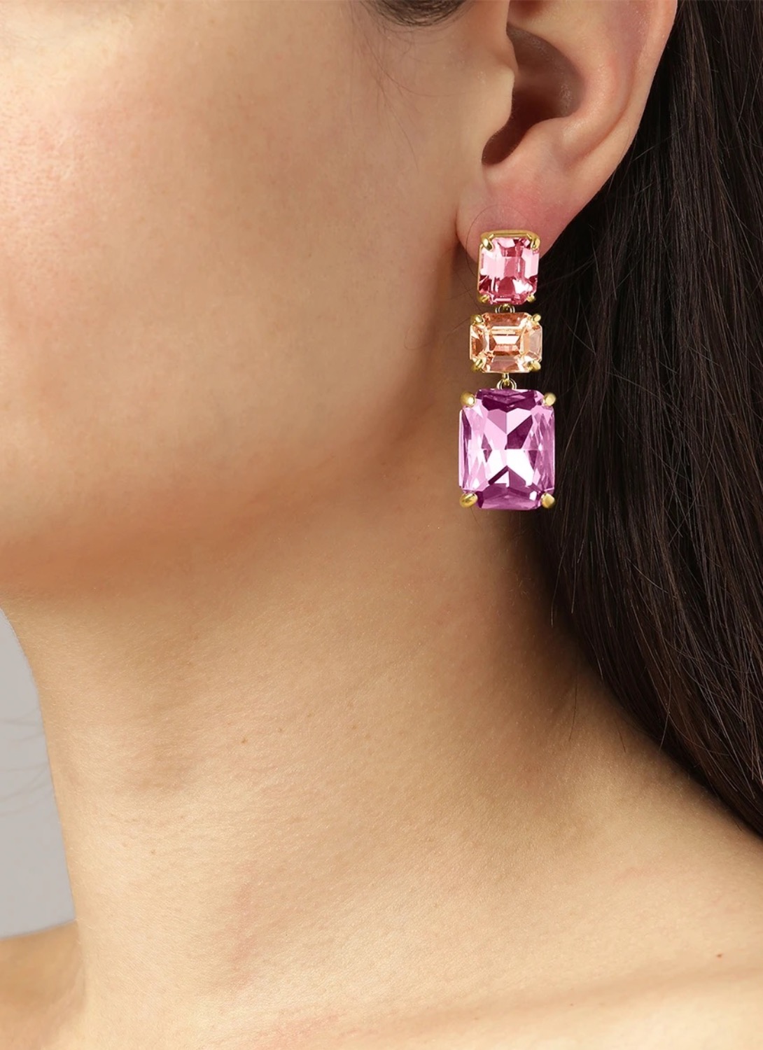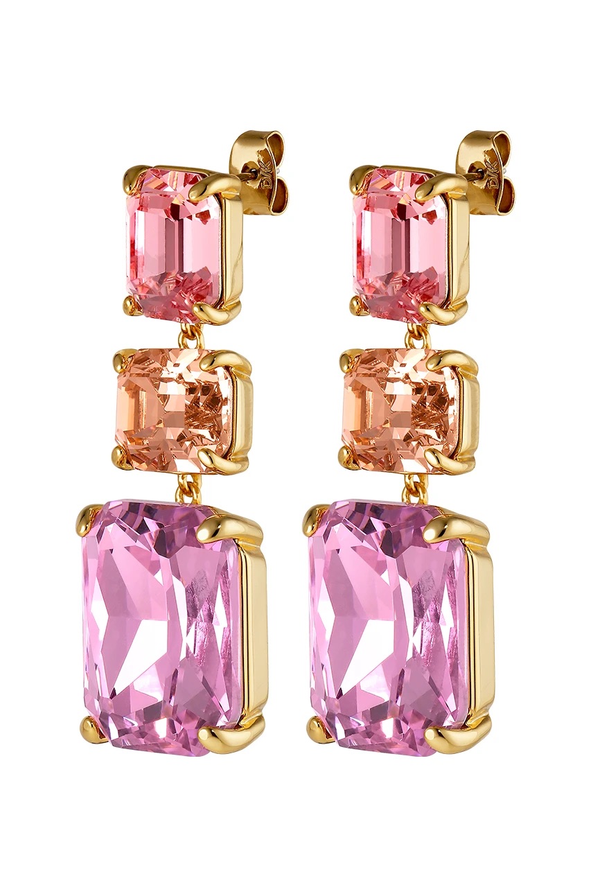 Серьги ESMARA (арт. 460014) от датского бренда Dyrberg Kern - это современная интерпретация стиля ар-деко в золотистом исполнении. Три огранённых кристалла эмеральд-кат расположены в строгой симметричной композиции: два персиковых кристалла по краям и один розовый - в центре. Вся композиция нанесена на благородное золотистое ионное покрытие. Общая длина серьги - около 35 мм, что делает её выразительной, но комфортной для ежедневного ношения.