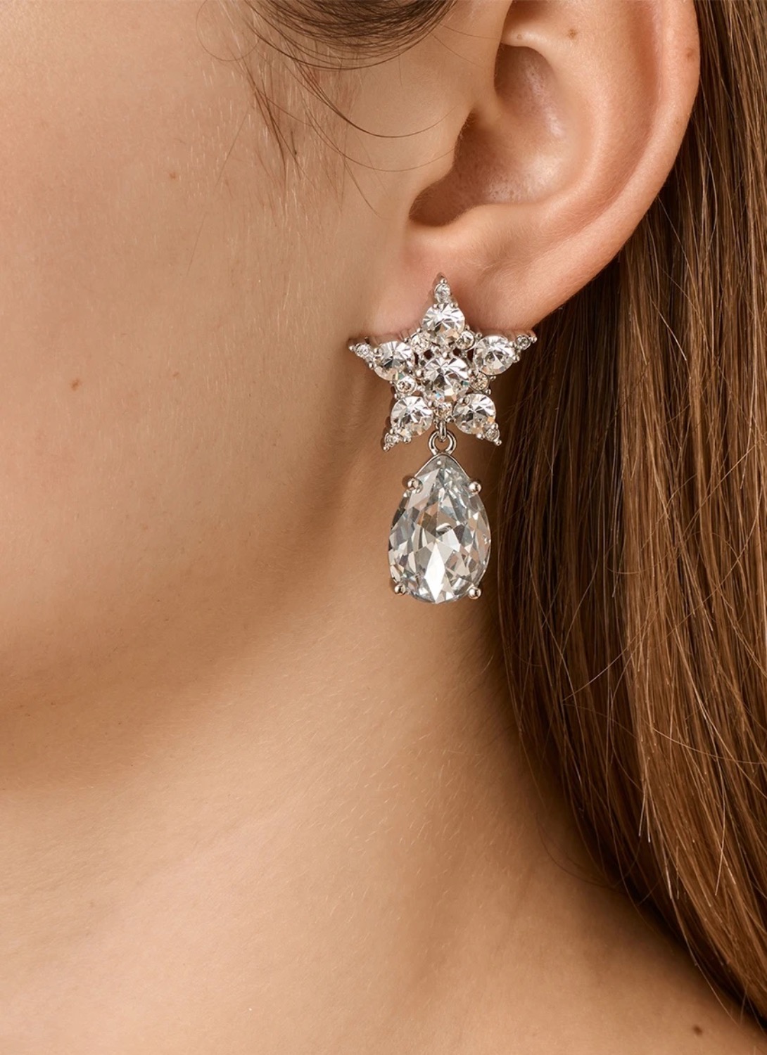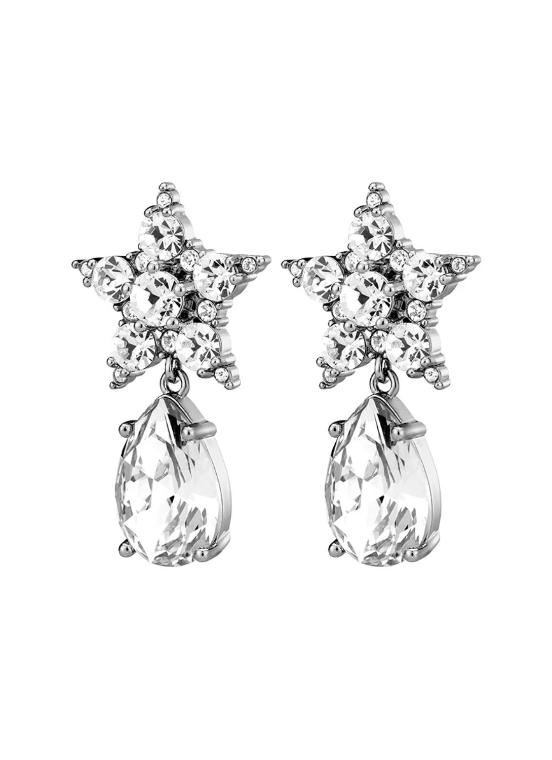 - Форма и дизайн: Звёздная форма сережек с подвеской-каплей, усыпанная множеством фасетированных белых кристаллов. Симметричный узор создает воздушный световой эффект.