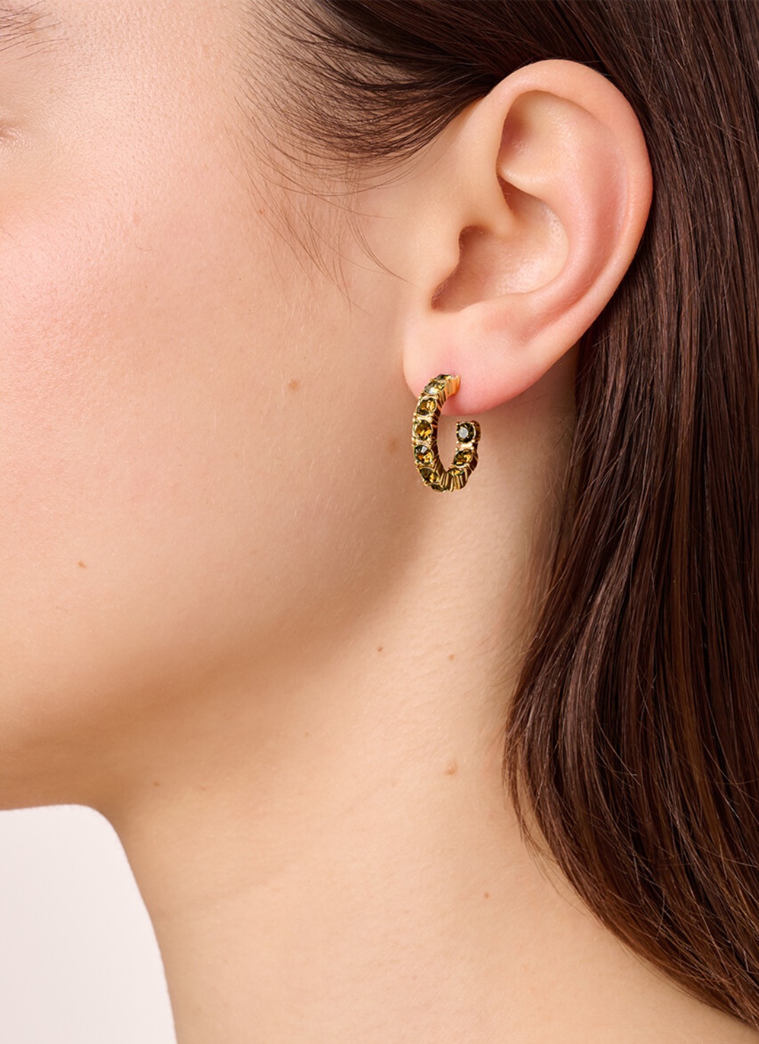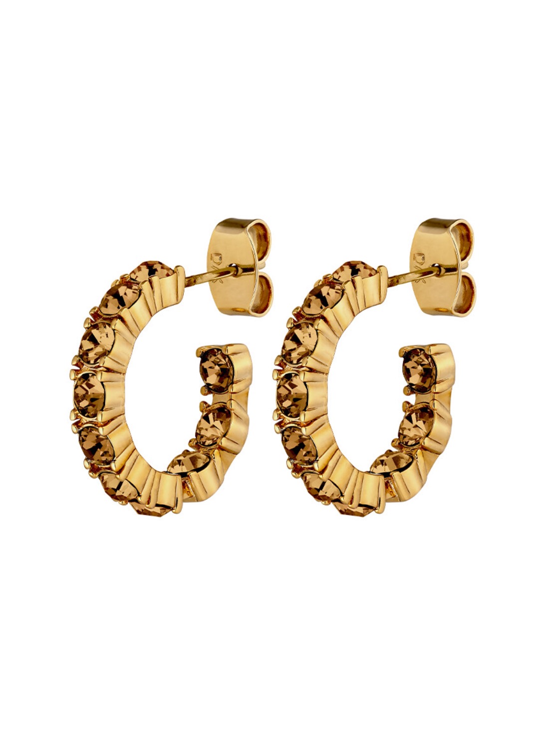Компактные серьги-хупы диаметром 18 мм полностью усыпаны кристаллами коричневого цвета не только спереди, но и с обратной стороны. Такой подход делает их эффектными в любом ракурсе - даже в профиль или при движении. Золотистое покрытие добавляет тёплую глубину, подчёркивая теплый оттенок камней.