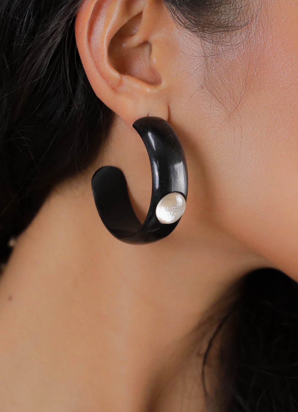 Эти серьги выполнены в форме элегантных полуколец длиной 5 см. В качестве вставки использованы натуральный рог, ракушка Capiz и прозрачная смола.
