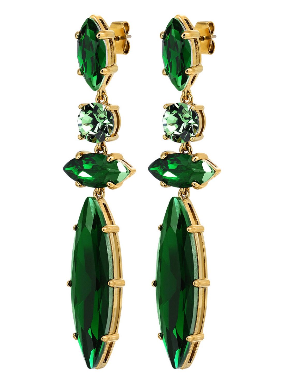 Четыре изумрудно-зелёных кристалла в огранке маркиза и многофасетной форме выстроены в вертикальную композицию. Длина 65 мм создаёт драматичный силуэт, а игра света на насыщенных гранях подчеркивает глубину оттенка и роскошь исполнения.