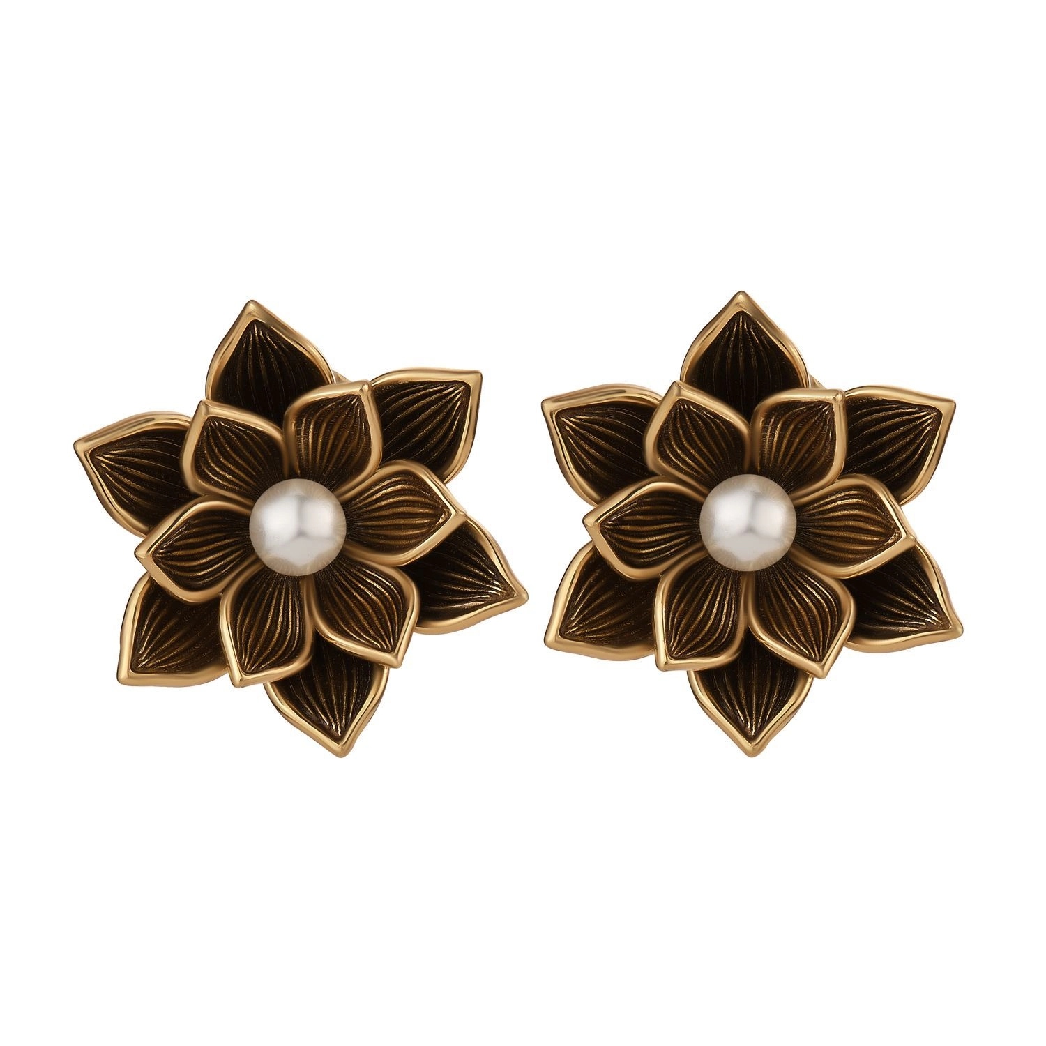 Особенность модели: Вертикальные канавки на лепестках имитируют прожилки живого цветка, придавая серьгам реализм и тактильную глубину. Покрытие выполнено по современной технологии нанокерамики в оттенке «античное золото» - оно устойчиво к царапинам, не тускнеет со временем и подчёркивает ручную работу. Патинирование усиливает рельеф, создавая контраст между светлыми гранями и тёмными углублениями. Застёжка: классические пусеты с заглушкой, обеспечивающие надёжную фиксацию и комфорт даже при длительном ношении. Вес пары всего 4,5 грамма.