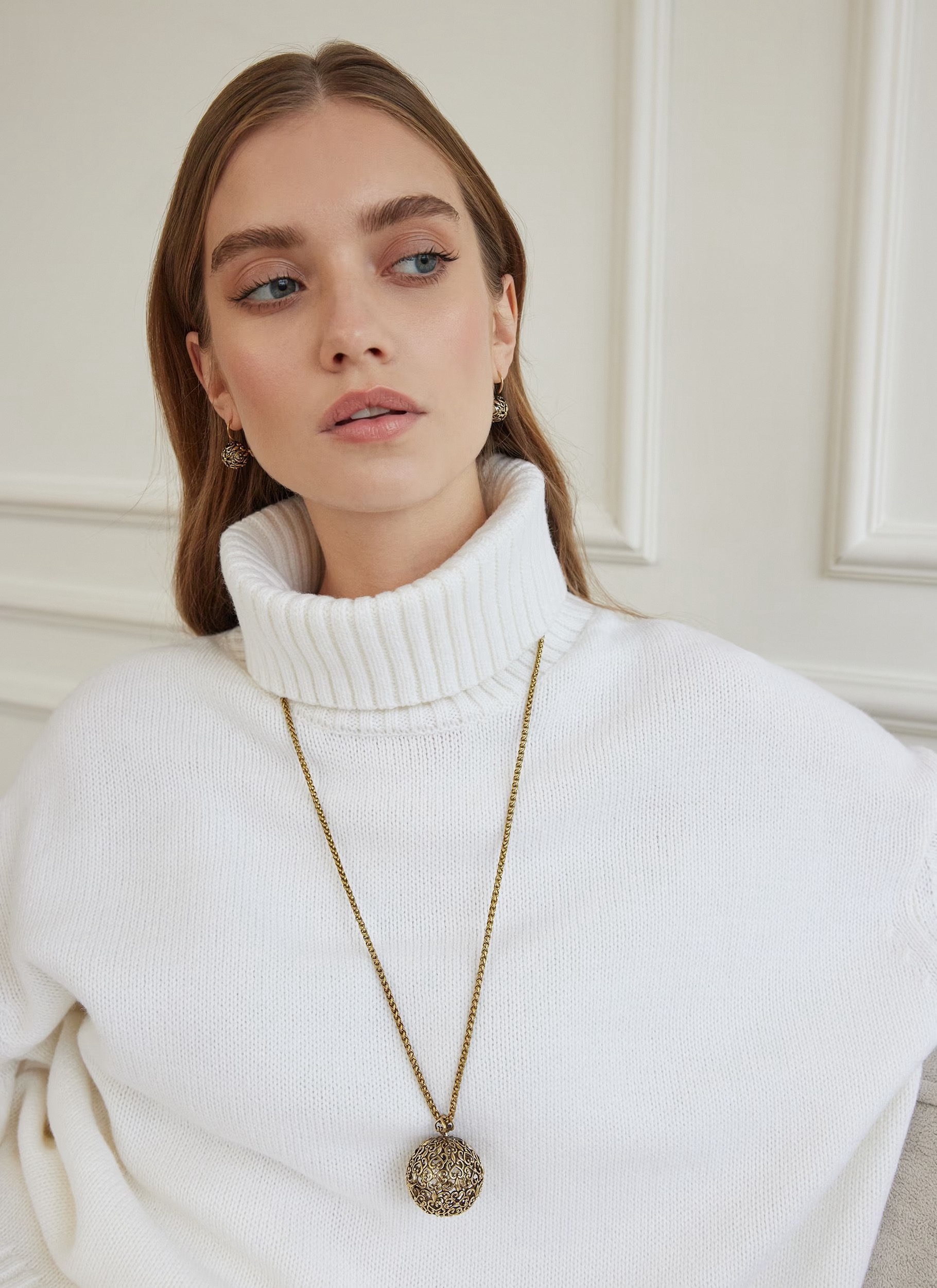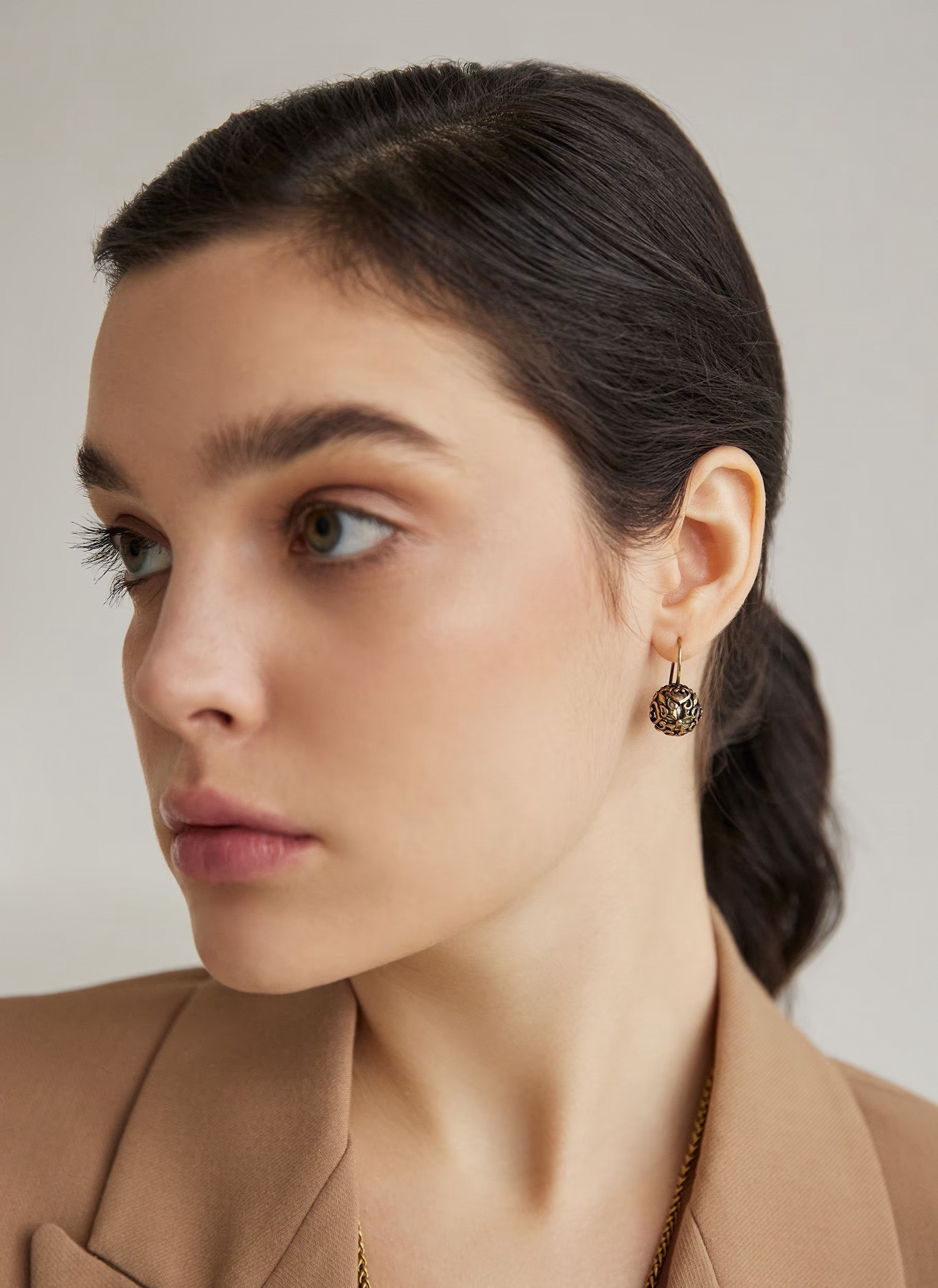 Особенность модели: Сфера диаметром 1,3 см кажется невесомой благодаря ажурной конструкции, но при этом сохраняет чёткую объёмную форму. Покрытие выполнено методом гальванического золочения, что обеспечивает устойчивость к царапинам и потускнению даже при ежедневном ношении. Французский замок гарантирует надёжную фиксацию, а общий вес пары всего 7,2 грамма - делает серьги комфортными даже при многочасовом использовании.