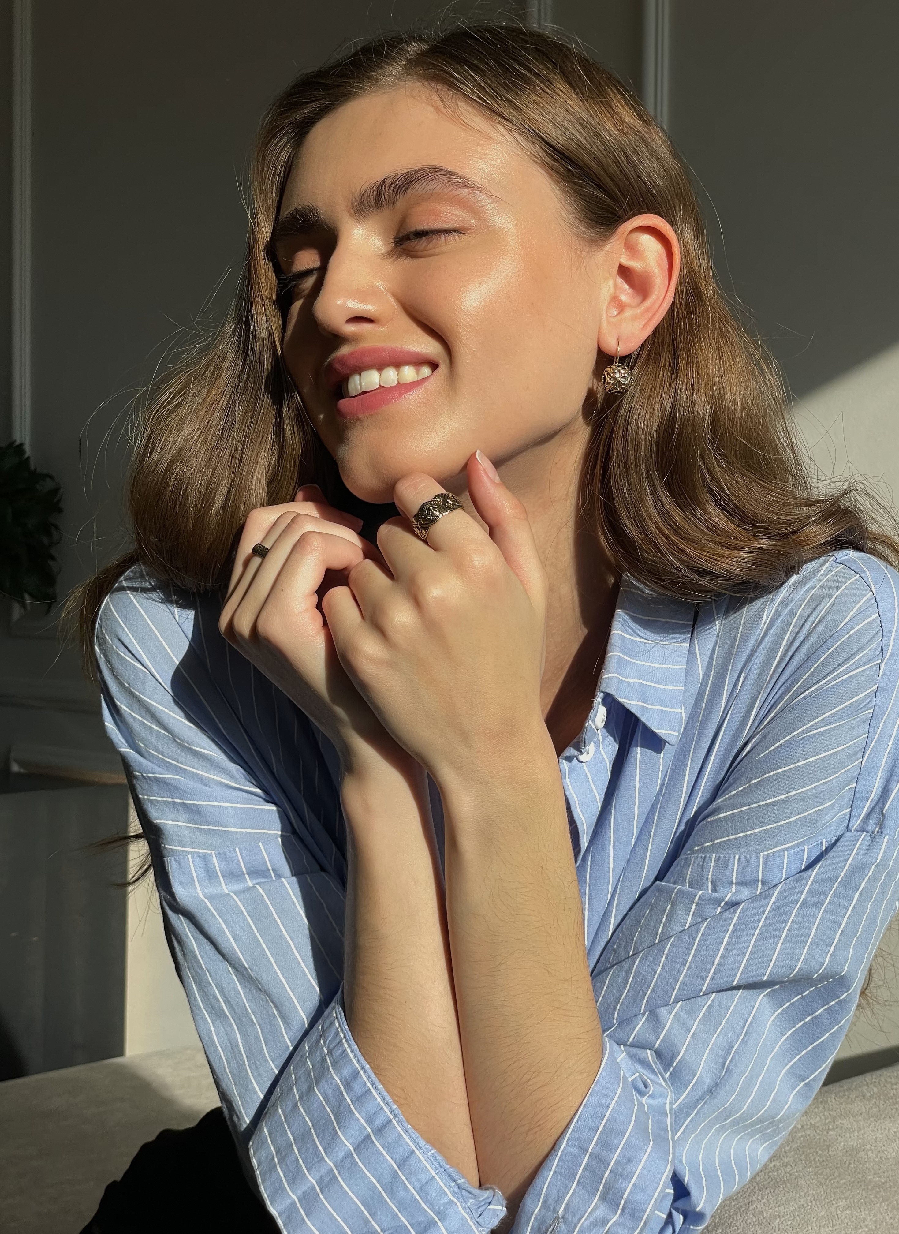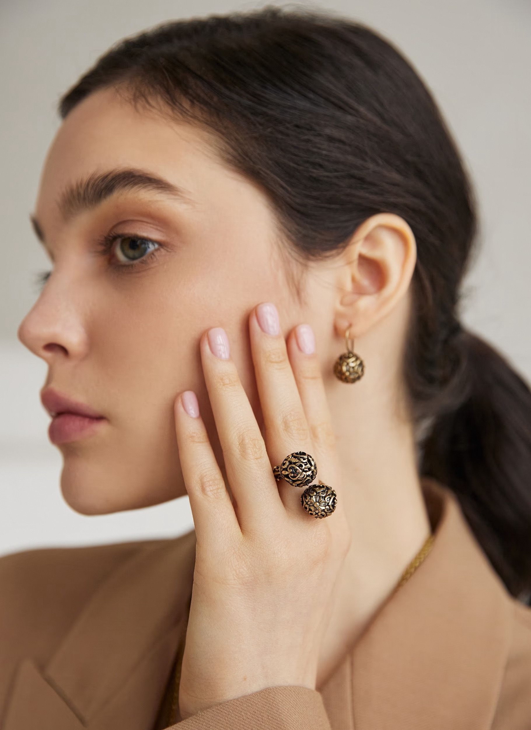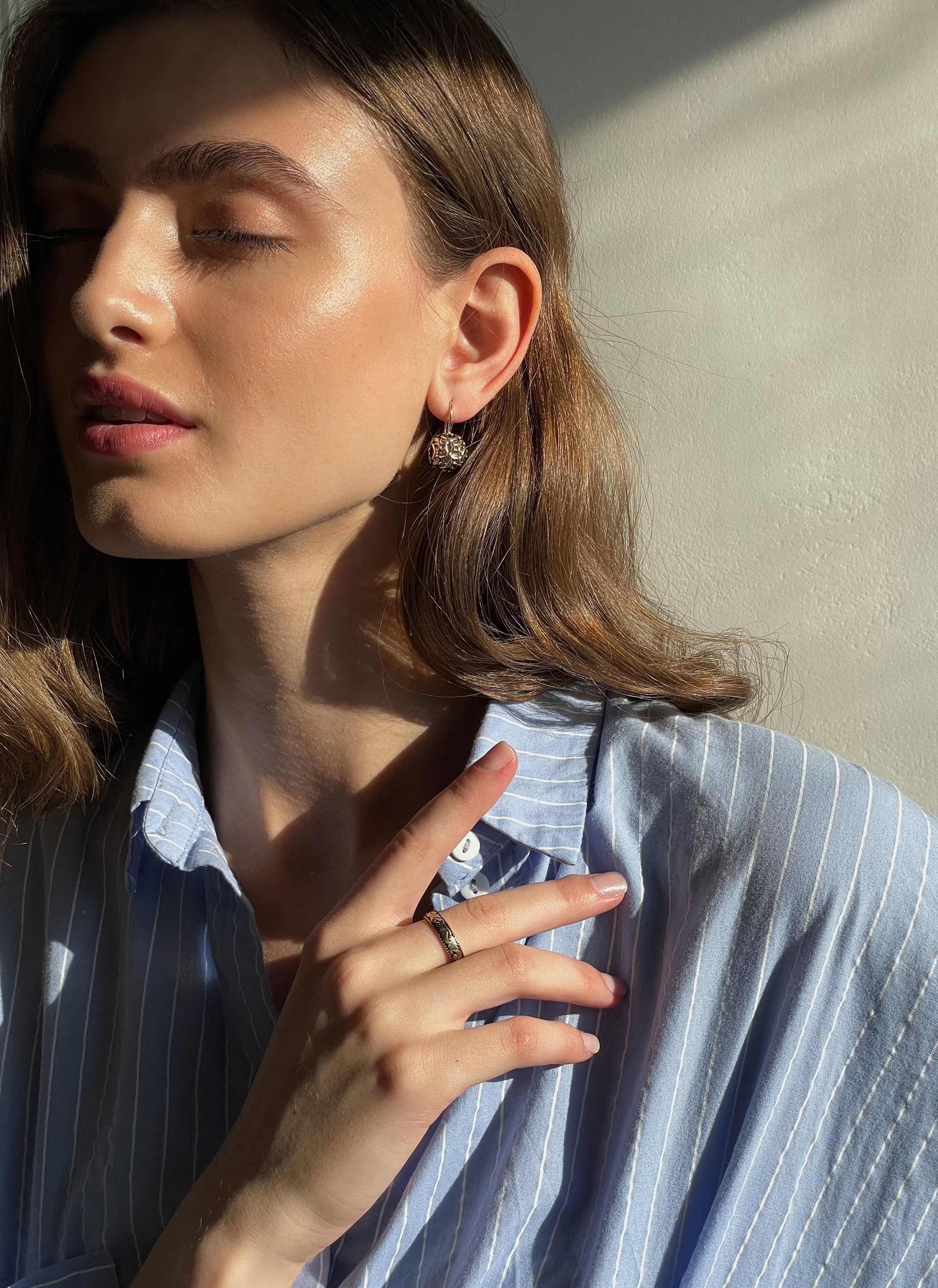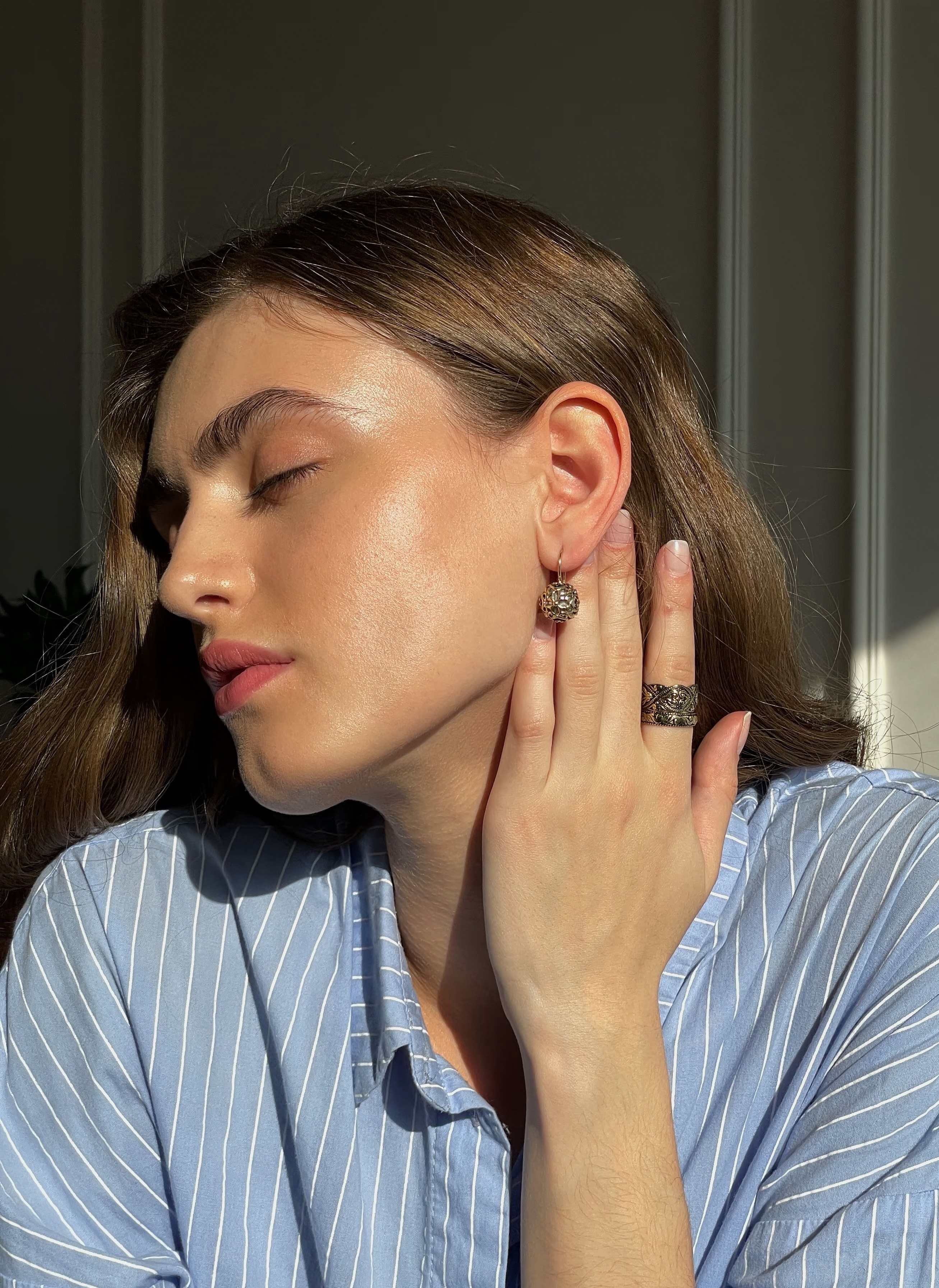 Носите их с причёской, открывающей лицо: пучком, лёгкими волнами или гладко зачёсанными назад волосами. Они особенно выигрышно смотрятся при дневном свете: ажурные тени и перламутр создают игру света и глубины. Серьги отлично сочетаются с одеждой в нейтральной палитре: бежевый, молочный, графит, тёмно-зелёный. Добавляют образу утончённости без пафоса.